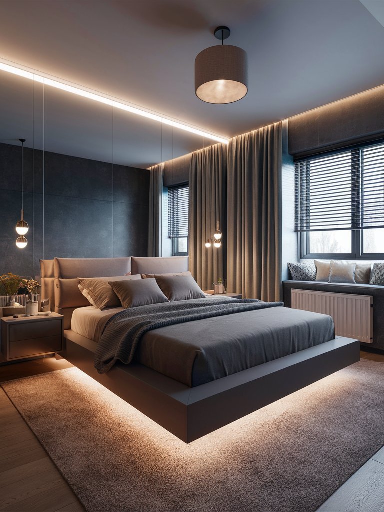 The integrated lighting under the bed and around the headboard is a subtle yet impactful design choice. This ambient lighting offers more than just functionality; it sets a calming mood in the bedroom. Perfect for winding down after a long day, the soft glow eliminates the need for overhead lighting, which can sometimes feel harsh in intimate spaces. This lighting design also highlights the architectural features of the room, drawing attention to the clean lines and structured layout. Additionally, the warm light balances the cooler tones of the gray bedding and walls, creating a harmonious atmosphere. This thoughtful integration of lighting ensures the room feels cozy and inviting while maintaining its sleek, modern character.
