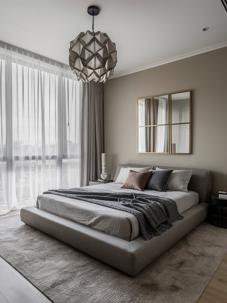 The floor-to-ceiling sheer curtains serve as a vital design element, filtering in natural light while preserving privacy. Their fluid, lightweight fabric introduces a softness that contrasts beautifully with the more structured elements in the room, such as the solid bed frame and angular mirror design. By allowing sunlight to diffuse into the space, the curtains enhance the calming ambiance and make the room feel larger and more open. Sheer curtains are not only practical but also stylish, adding a sense of luxury to any bedroom.