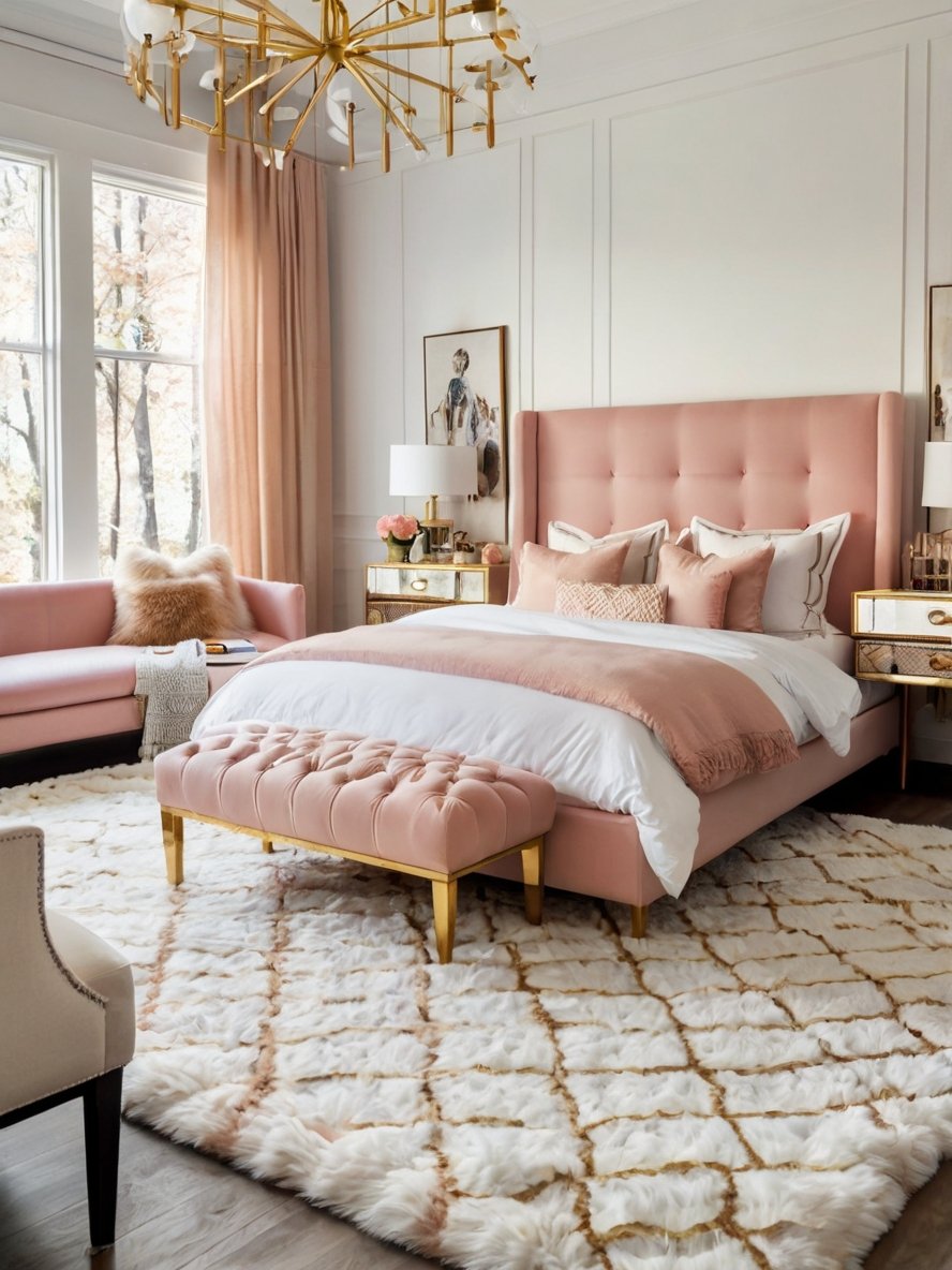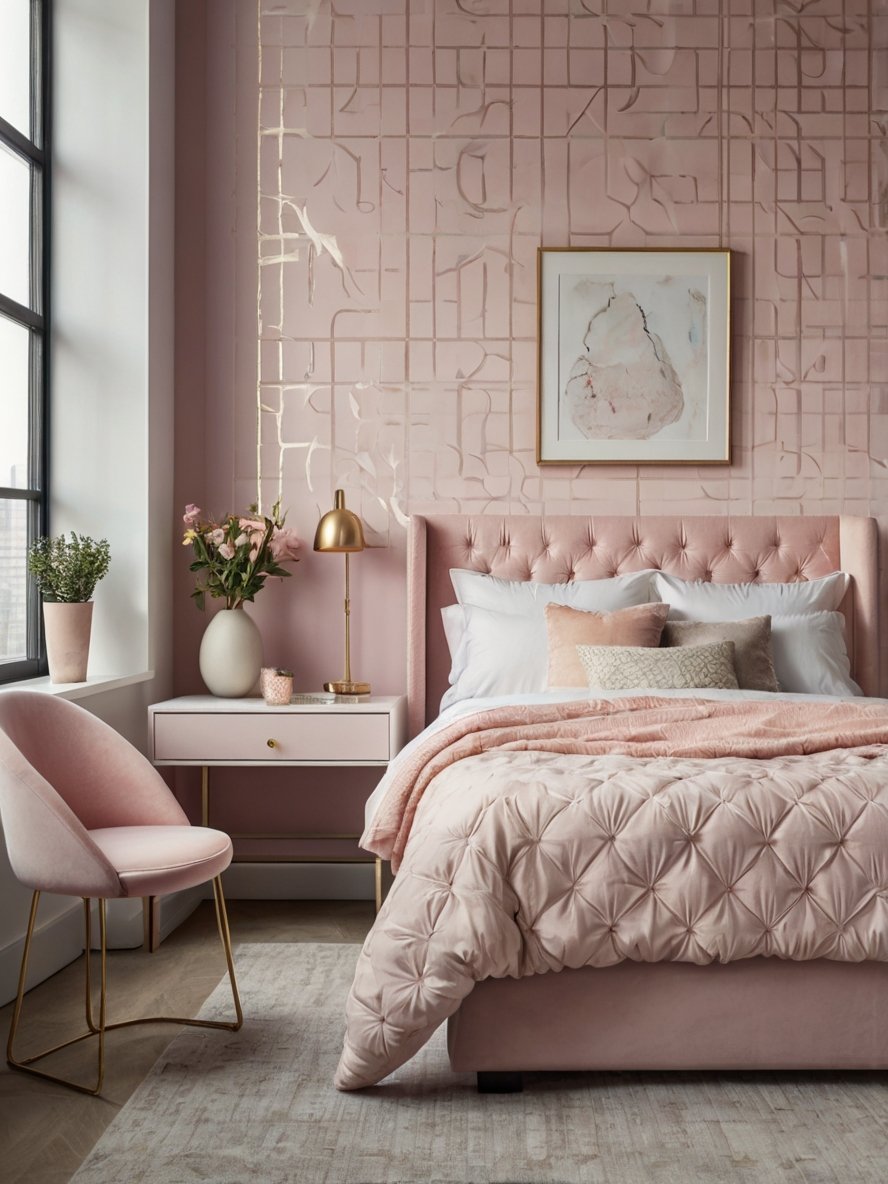 This modern bedroom embraces a sophisticated blush pink palette, creating a tranquil yet luxurious atmosphere. The soft pink hues are perfectly balanced with neutral whites and gold accents, avoiding an overly saccharine look. The blush pink upholstered bed frame serves as the room’s focal point, and its tufted headboard adds both elegance and texture. Complementing the bed are matching pink curtains, which add warmth and softness to the overall design. This choice of color palette is both timeless and versatile, making it ideal for anyone seeking a chic, feminine retreat without compromising on modern sophistication.