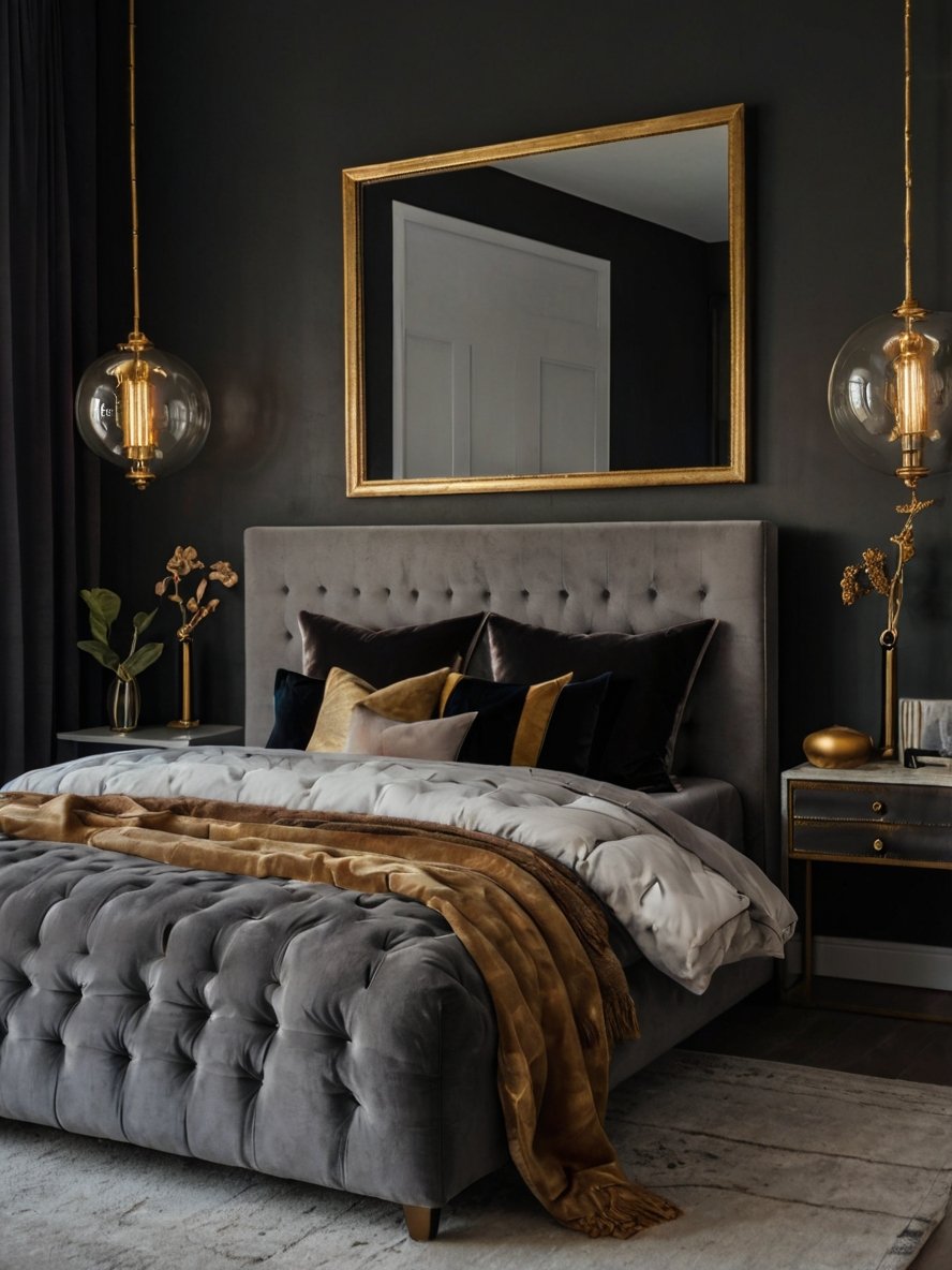 The large, gold-edged mirror above the bed serves as the room’s focal point, adding depth and grandeur. Its reflective surface helps bounce light around the space, which is especially important in a darker color scheme. This placement draws the eye upward, making the room feel taller and more spacious. Mirrors like this are a great choice for enhancing both functionality and style, blending seamlessly into a luxurious setting.