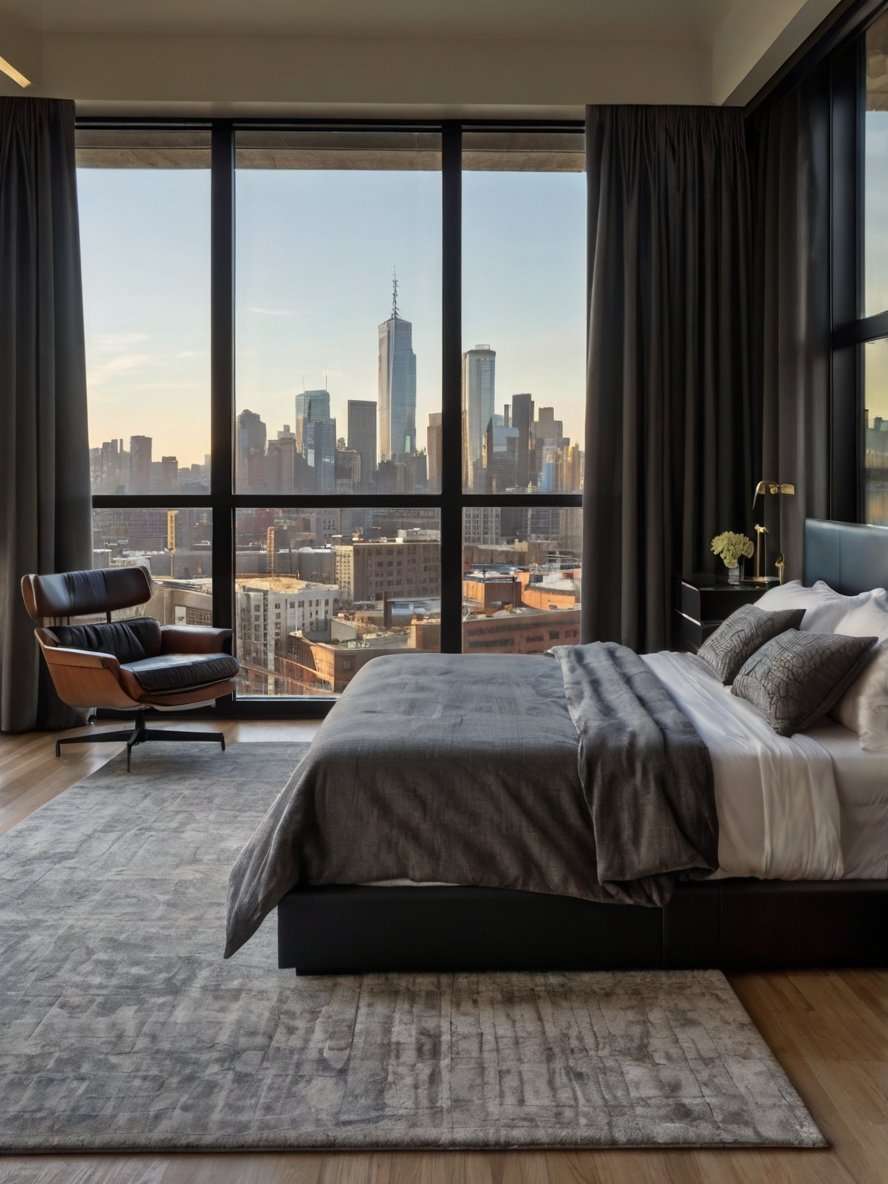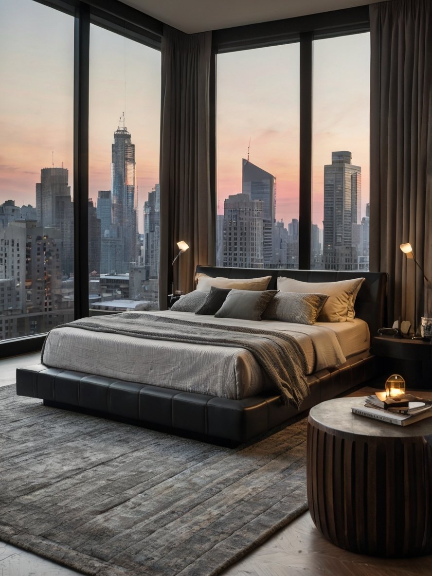 The floor-to-ceiling windows are undoubtedly the highlight of this bedroom, framing a stunning urban skyline. These expansive glass panels bring the outdoors inside, allowing natural light to flood the space during the day while showcasing the city lights at night. This design choice not only emphasizes the room’s modernity but also creates a connection with the dynamic energy of city living. The windows eliminate the need for excessive wall decor, as the breathtaking view becomes the centerpiece. Paired with subtle, neutral curtains, the design maintains privacy while retaining the ability to showcase the skyline. This integration of nature and architecture embodies the sophistication of modern design.