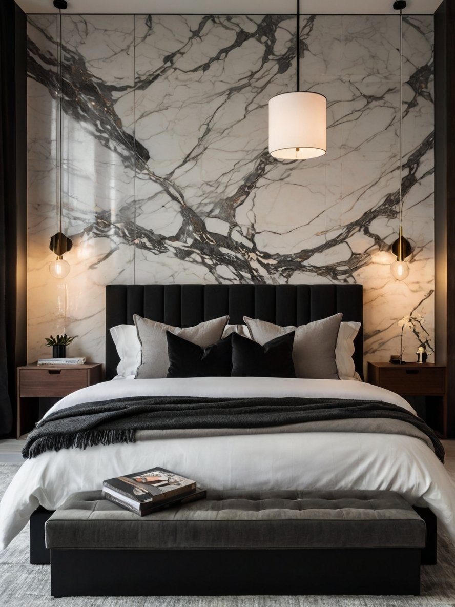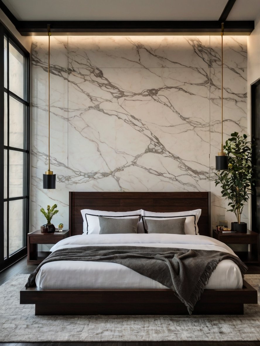 This modern bedroom immediately commands attention with its bold, luxurious marble accent wall. The intricate black veins cutting across the pristine white marble add a sense of grandeur and drama, setting the tone for the entire space. Paired with the understated dark headboard, the wall becomes the undeniable focal point, blending opulence with minimalism. Marble as an element, not only exudes luxury but also enhances the light in the room by reflecting it beautifully, especially during the day. This feature could serve as an inspiration for homeowners aiming to make a bold statement without overloading the design. Incorporating lighting, such as the suspended pendant lights on either side of the bed, complements the wall perfectly and adds warmth. The subtle contrast between the textures and colors is a masterstroke in modern bedroom design.