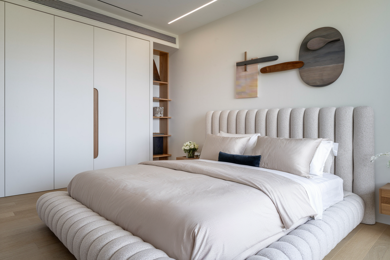 The bed in this modern bedroom takes center stage with its minimalist yet cozy design. The upholstered headboard, in a soft beige texture, provides both comfort and aesthetic appeal. Its neutral tone harmonizes seamlessly with the overall palette of the room, adding warmth to the clean, structured lines of the modern design. Paired with pristine white bedding and a textured throw, the bed exudes a sense of calm and relaxation. The wooden legs of the frame further enhance the natural elements in the room, tying into the broader theme of understated elegance. This bed isn’t just a piece of furniture; it’s a statement of serenity.