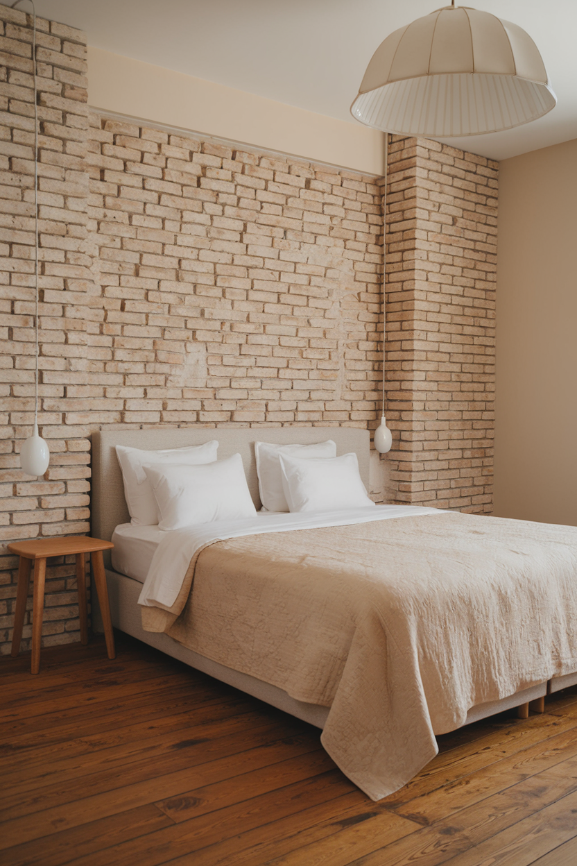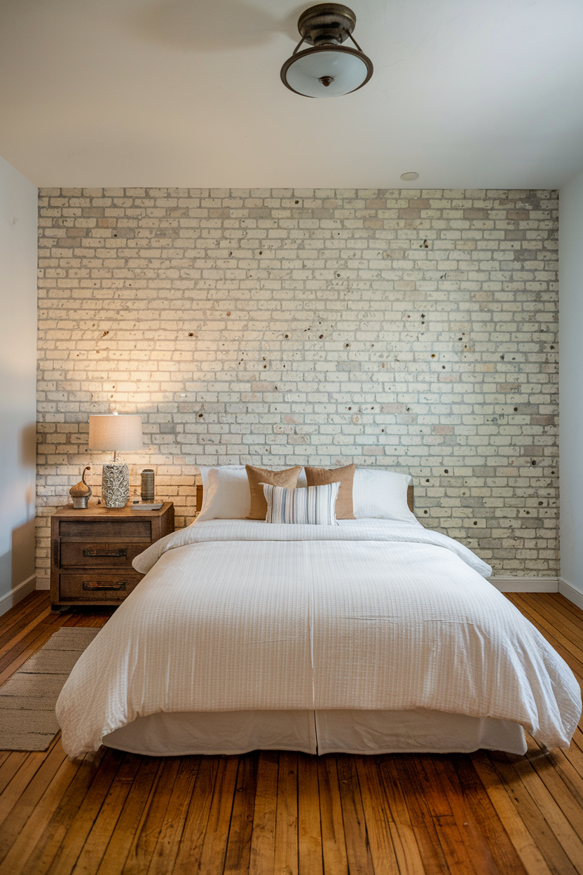 A brick feature wall behind the bed creates a cozy, inviting atmosphere that’s perfect for a bedroom retreat. The natural texture of the brick brings warmth and depth to the room, especially when paired with soft textiles, wooden furniture, and ambient lighting. Whether you go for an entire wall or a partial section, a brick accent wall behind the bed creates a beautiful contrast with bedding and helps define the space.