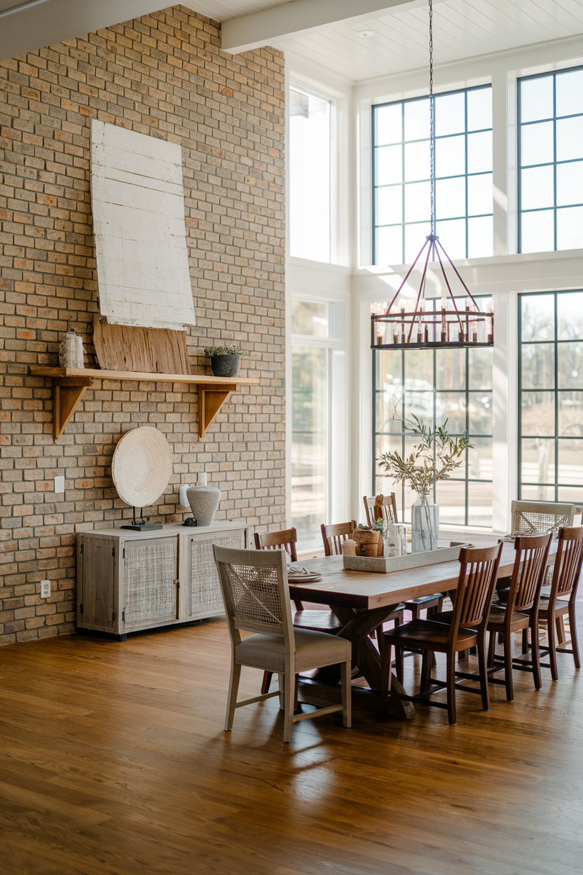 A brick accent wall in the dining room can completely change the mood of the space, adding an element of warmth and sophistication. The earthy tones of the brick contrast beautifully with formal dining tables and elegant chairs, making the room feel both relaxed and refined. Paired with soft lighting and neutral decor, a brick feature in the dining room creates a timeless atmosphere for family meals and dinner parties.