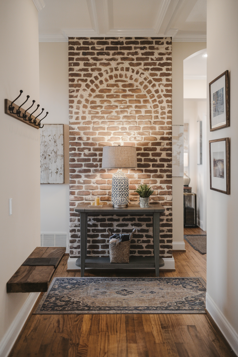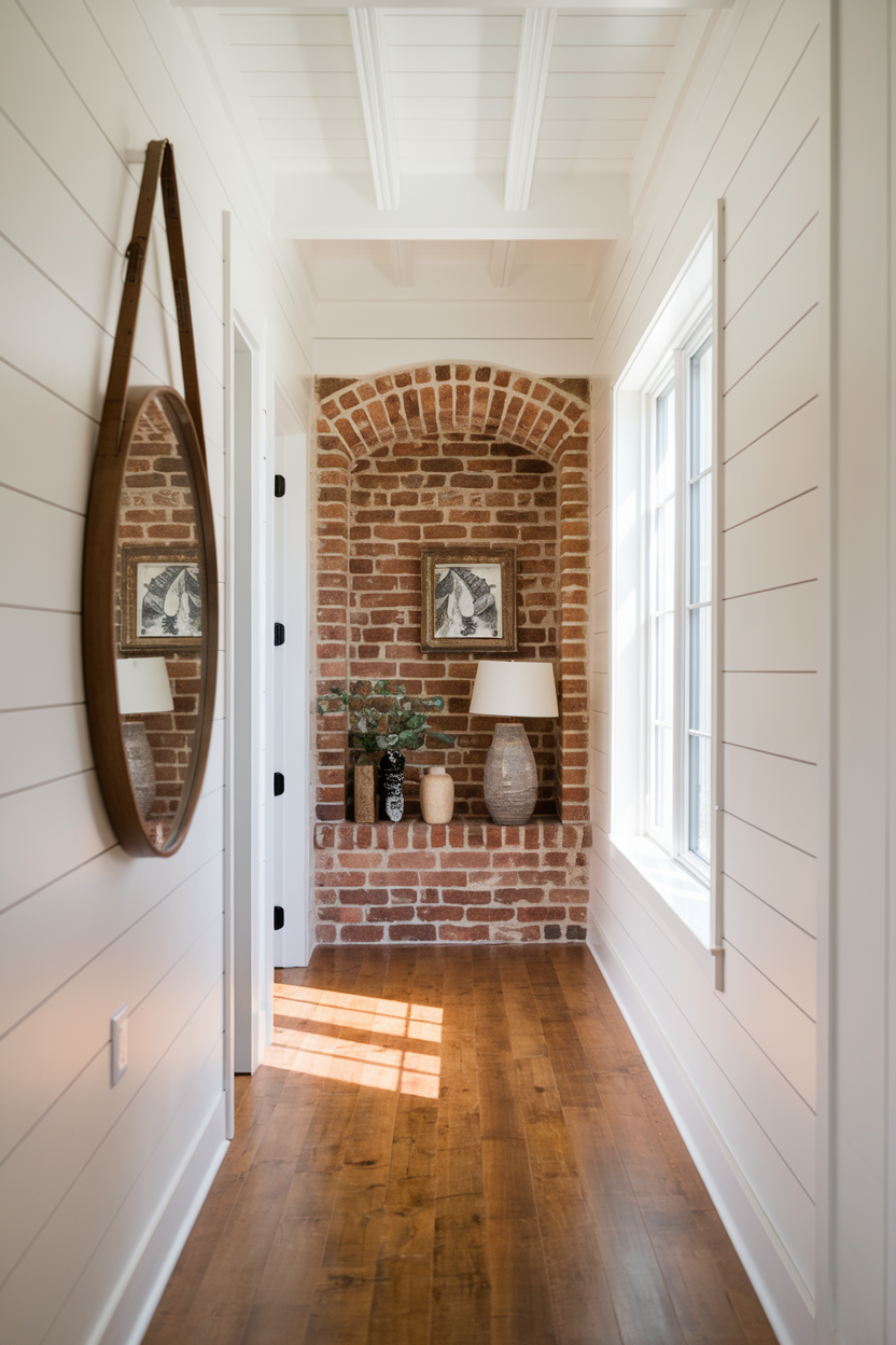 Introducing brick accents into a hallway niche can transform an otherwise simple space into a design feature. Use brick to frame alcoves for displaying art, sculptures, or plants, and create a sense of depth and dimension in narrow hallways. This small touch can add warmth and texture without overwhelming the space, helping to create a balanced and visually appealing corridor.