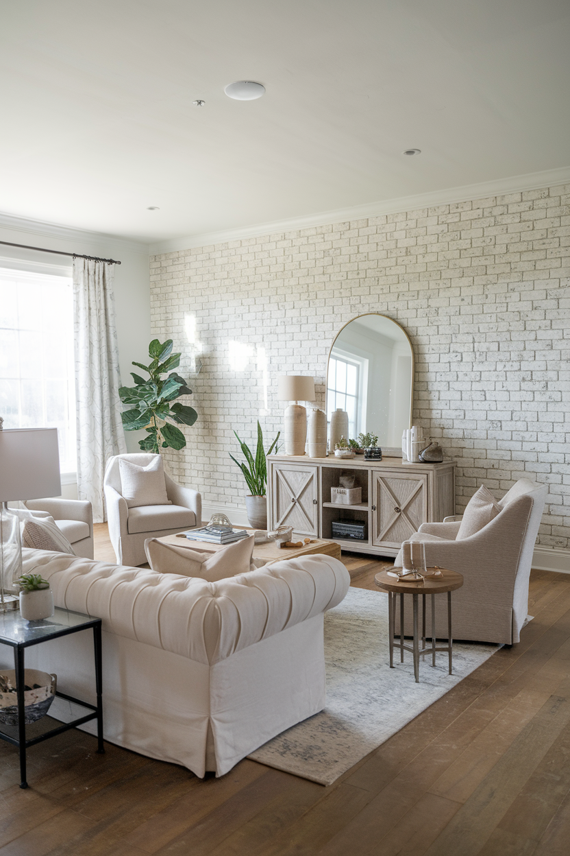For those who love the rustic appeal of brick but want a softer, more airy aesthetic, whitewashed brick is an excellent choice. The whitewashed effect gives the brick a lighter, more contemporary feel while maintaining its natural texture. It’s perfect for smaller spaces or homes that prefer a brighter, more open atmosphere. Pairing whitewashed brick with light-colored furniture, soft textiles, and minimal decor creates an inviting, serene ambiance.