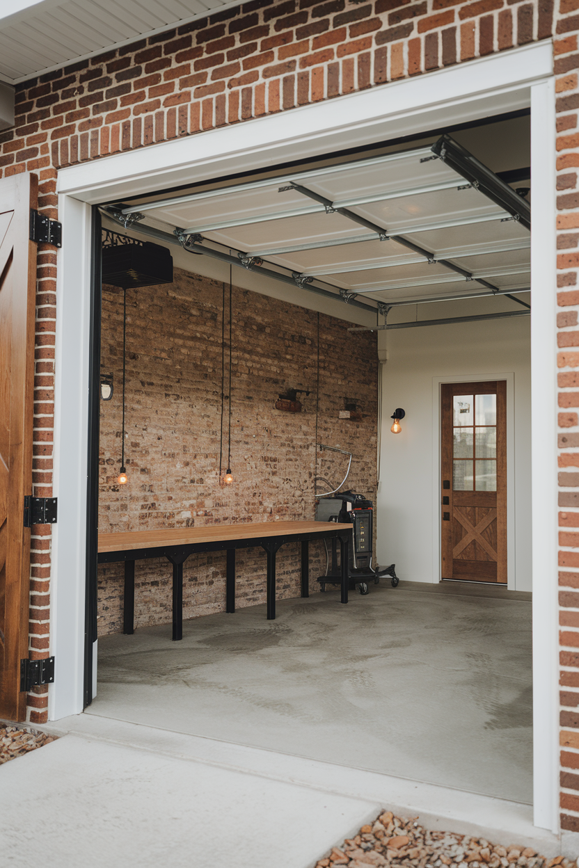 An exposed brick wall in the garage adds a surprising element of style to an often-overlooked space. The rustic texture contrasts beautifully with steel or wooden garage doors, while the natural materials create a warm, industrial feel. Brick can help turn a utilitarian area into a more functional and aesthetically pleasing part of your home, especially when paired with shelving or a workbench that complements the raw charm of the brick.