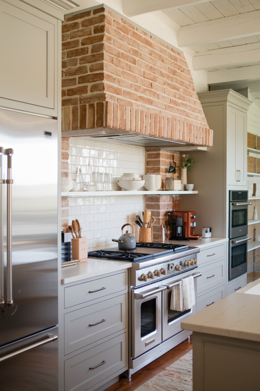 Adding a brick accent to the side of your kitchen cabinets or around the pantry helps introduce an unexpected rustic charm that contrasts beautifully with sleek cabinetry and modern appliances. This feature brings a warm, natural element to a space that is often filled with polished materials. Whether it’s a subtle brick veneer or a full brick surround, the textural contrast enhances the overall aesthetic of the kitchen.