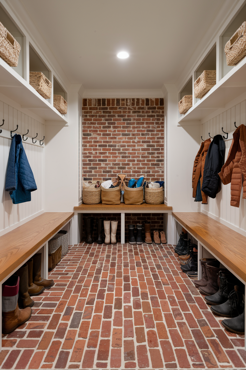 Mudrooms are practical, but they don’t have to be purely functional. Incorporating brick into this hardworking space adds texture and visual interest while enhancing its rustic appeal. A brick floor, backsplash, or accent wall can create a cozy environment that balances the utilitarian elements of the room. It pairs beautifully with wooden benches, hooks, and woven baskets, making the space both stylish and practical for handling shoes, coats, and other outdoor gear.