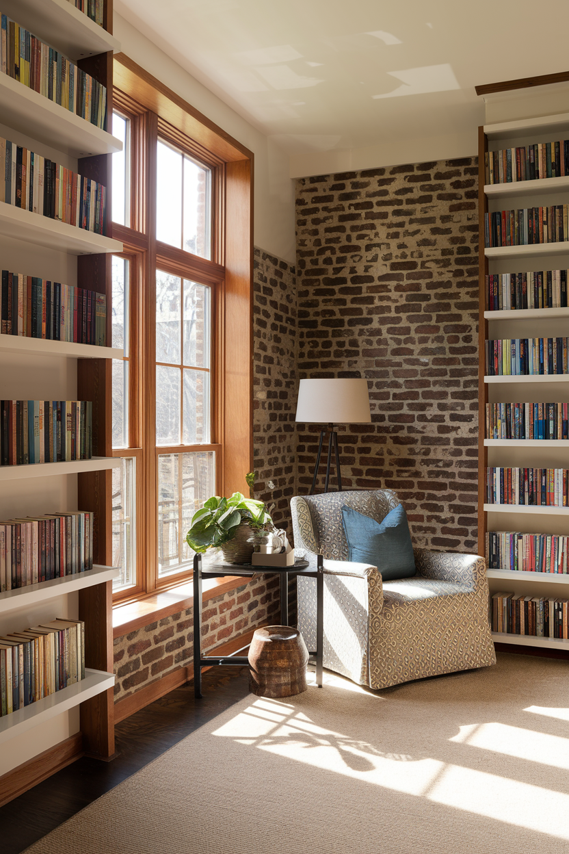 For book lovers, adding a brick accent to the library or reading nook brings timeless elegance to the space. The rough texture of the brick creates a warm, cozy environment that’s perfect for reading and relaxation. Brick can be used for an entire wall or just as an accent around shelves or a reading chair. The juxtaposition of the rugged brick against rows of neatly organized books enhances the intellectual atmosphere and creates a visually appealing backdrop for quiet moments.