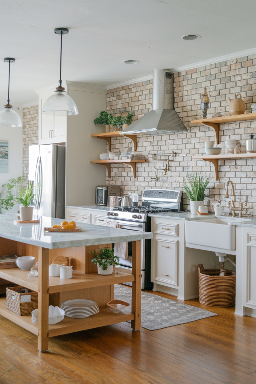 For a unique twist on traditional kitchen design, consider wrapping your kitchen island with brick. This design idea introduces the timeless charm of brick while adding texture and visual interest to the kitchen. Paired with wood cabinetry and modern countertops, a brick island becomes a stunning focal point that enhances the farmhouse, rustic, or even modern aesthetic of the space. The durability of brick also makes it a great choice for high-use areas like the kitchen.