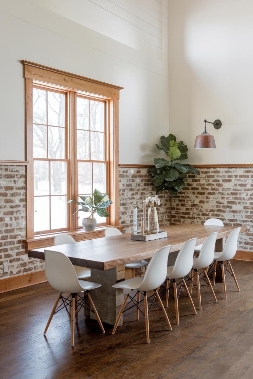 Brick wainscoting is a subtle yet striking way to add rustic flair to any room. Covering the lower half of the walls creates a grounded, balanced look that works particularly well in dining rooms, kitchens, or even bathrooms. This classic treatment pairs beautifully with wood paneling or neutral paint colors above it. The combination of materials adds visual interest without overwhelming the space, providing a perfect balance of rustic charm and contemporary sophistication.