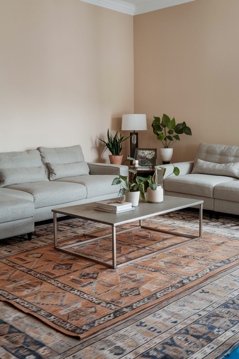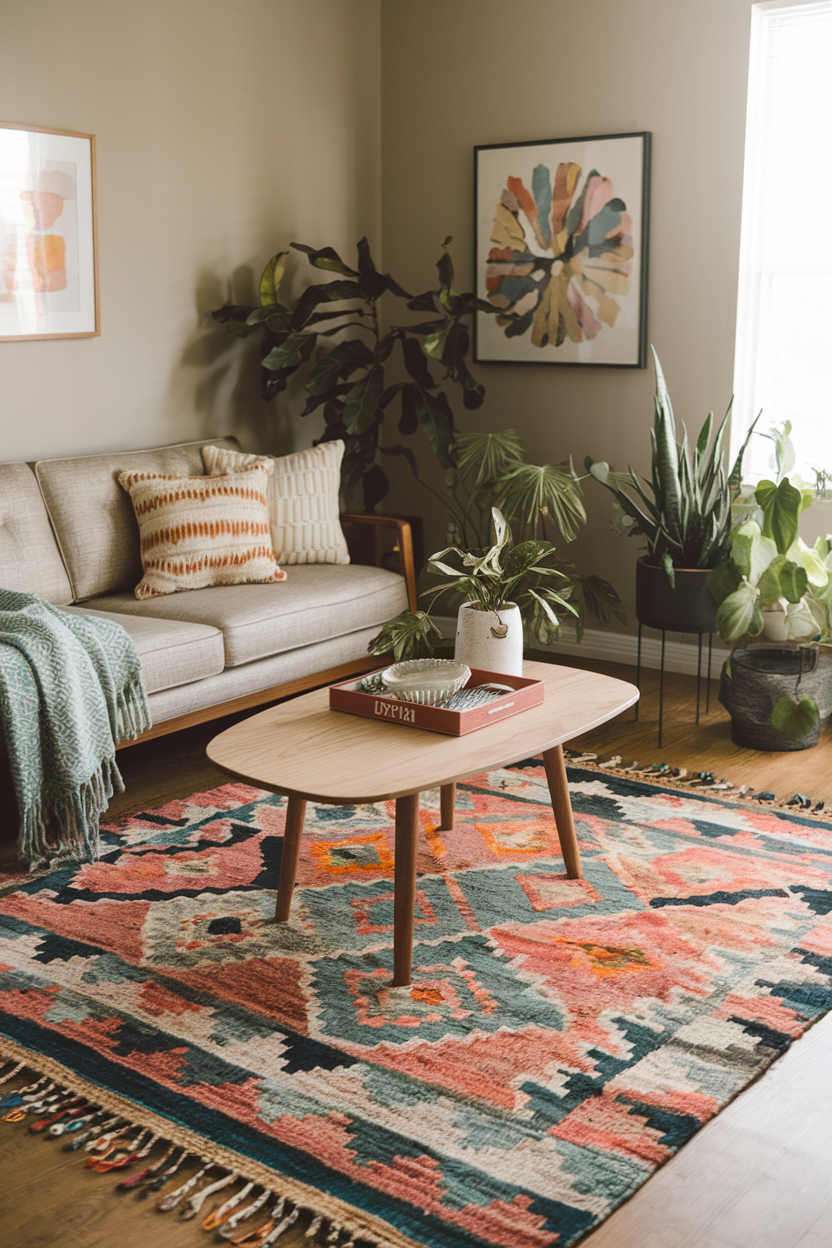 A colorful bohemian rug layered with geometric prints and tribal patterns instantly energizes any space. These rugs often come in a mix of warm and cool tones, creating a playful yet grounded aesthetic that feels lived-in and welcoming. Pair them with natural textures, like rattan or macramé, and you’ll have a living room that exudes personality and warmth without trying too hard. Their layered visual interest makes them perfect for adding depth and soul to otherwise neutral furniture.