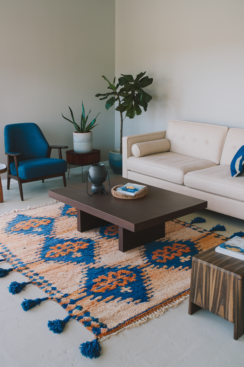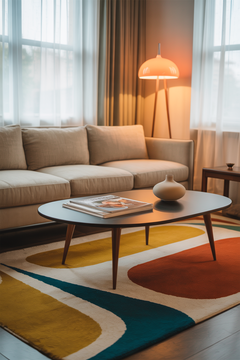 Rugs with retro shapes and atomic-era color palettes like mustard, teal, and burnt orange help create a fun, design-forward vibe. Their distinctive style works well with wooden legs, tapered furniture, and vintage lighting. By adding a mid-century modern rug, you can effortlessly tie together furniture from different eras into a cohesive, nostalgic yet modern aesthetic.