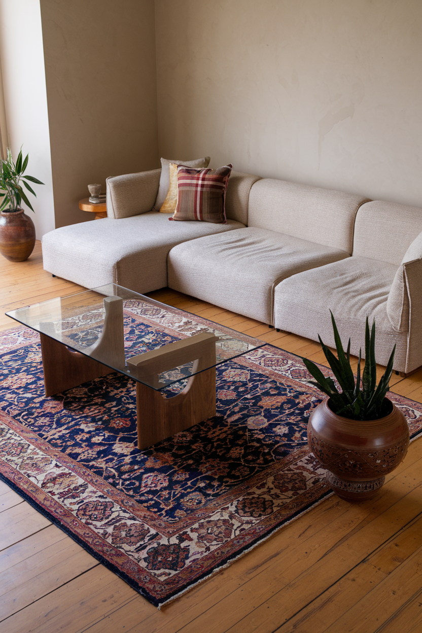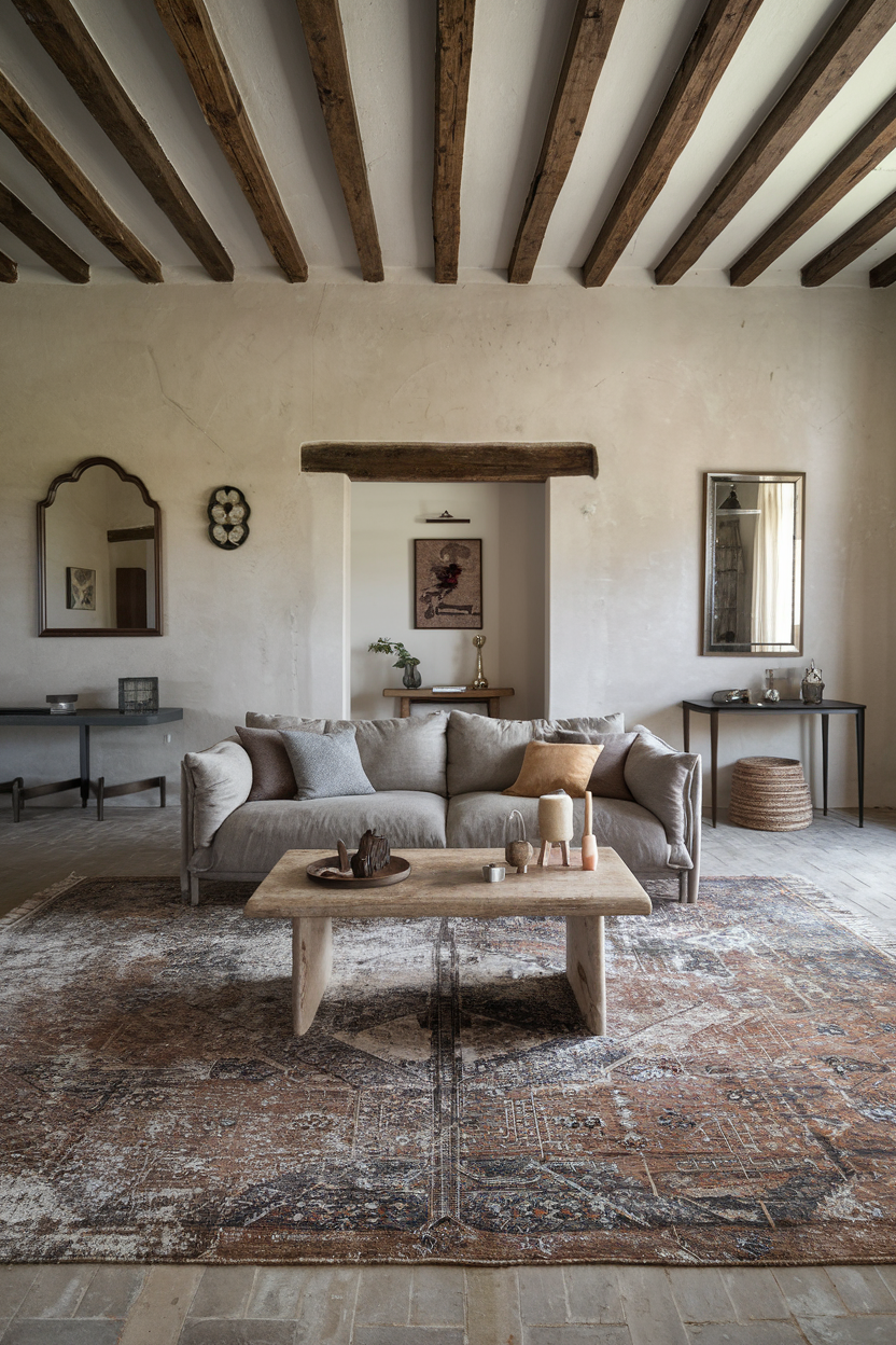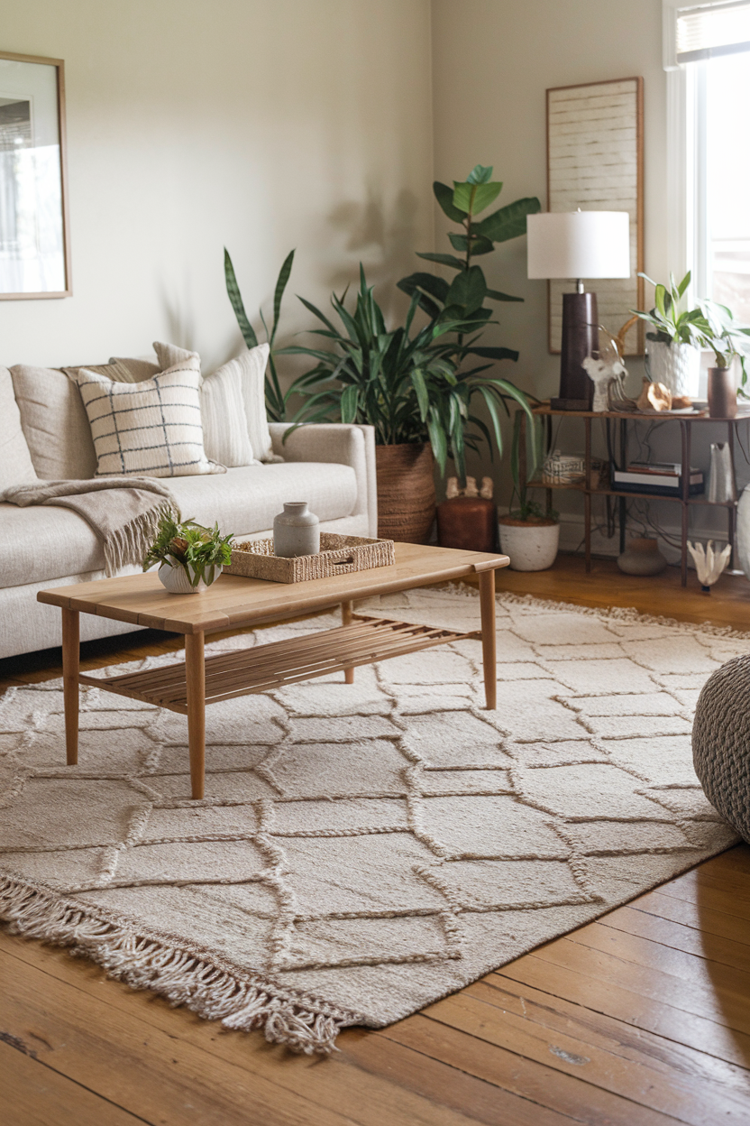 Layering rugs (placing a patterned rug over a larger neutral one) adds depth and visual interest. It also gives you the flexibility to mix styles and textures. For example, you can combine a jute rug with a smaller vintage kilim or a colorful tufted rug. This approach adds personality and softness while allowing for seasonal swaps or easy updates when your design taste evolves.
