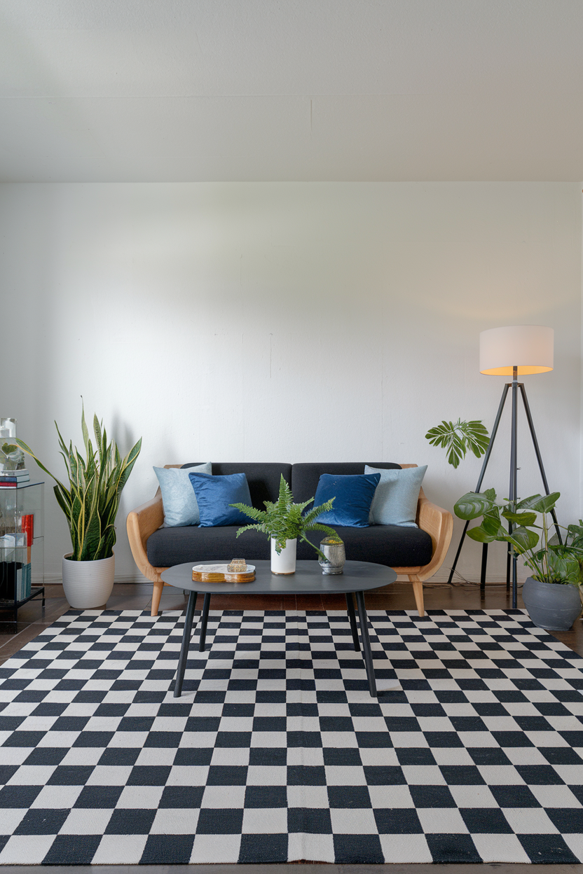 Checkerboard rugs bring playful order and graphic punch. Whether in classic black and white or muted color variations, they add structure and a bit of retro charm. These rugs are trending in modern and maximalist spaces, where their crisp lines contrast beautifully with softer textures and curved furniture. They also work well as a whimsical foundation for eclectic accessories.