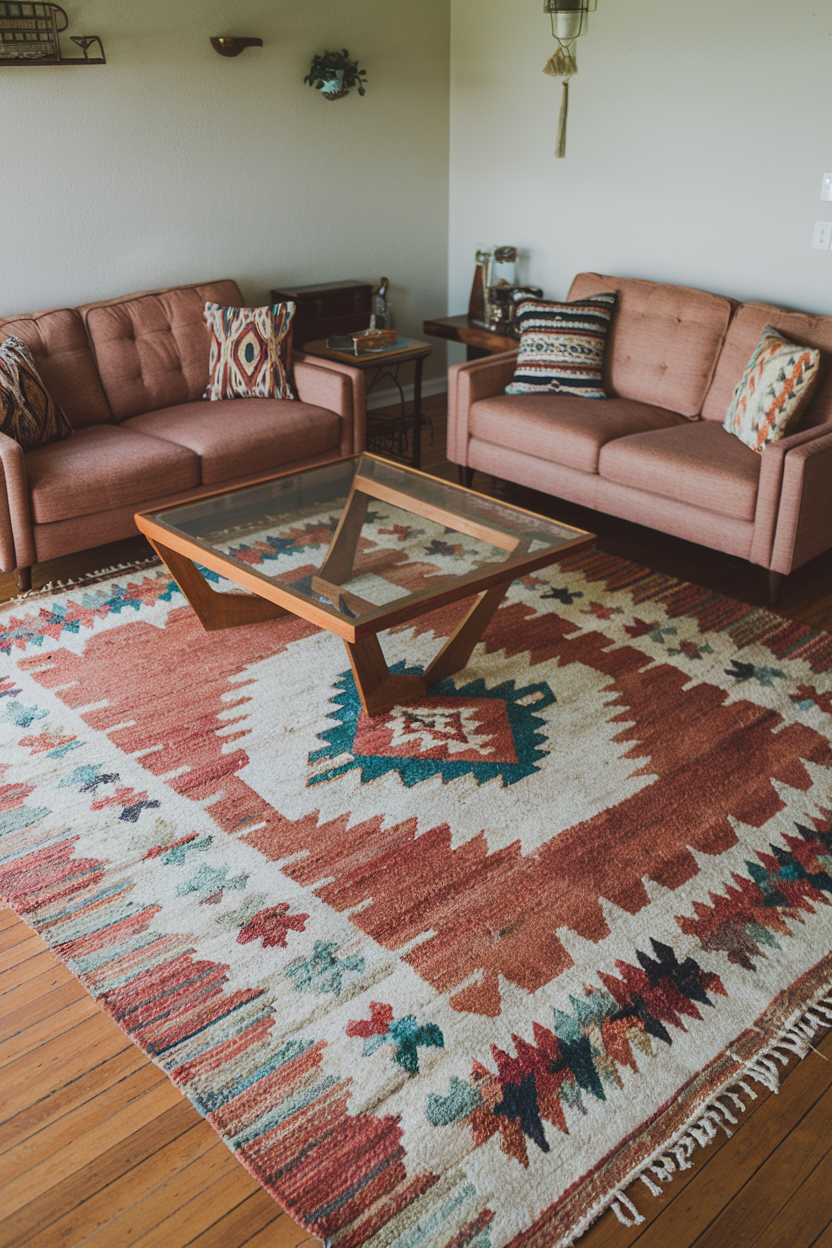 Patterns inspired by Native American motifs and earthy desert palettes offer a grounded, natural energy. Terracotta, rust, teal, and sand tones combine to create a warm and rugged aesthetic. These rugs add character and heritage, making them ideal for rustic, boho, or Western-themed living rooms. Pair with raw wood, leather, and handcrafted decor for full effect.