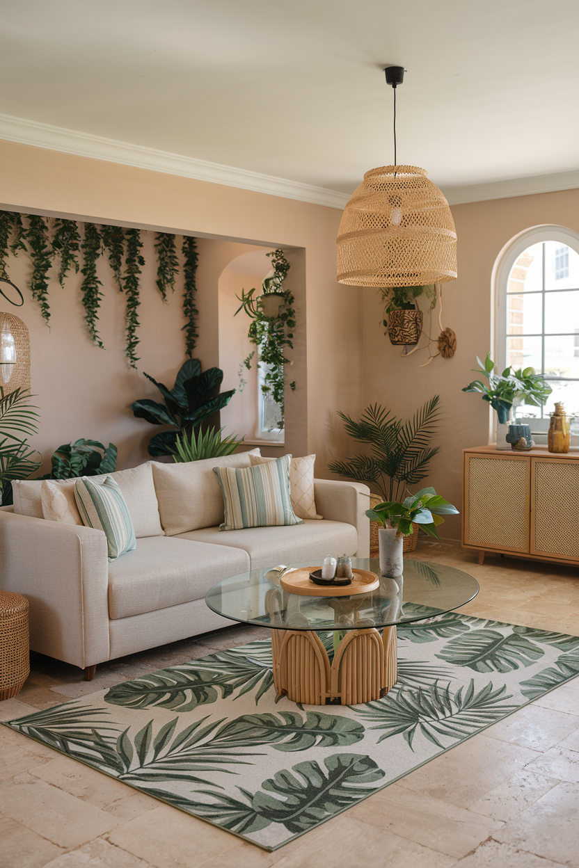 Rugs featuring palm leaves, banana fronds, or jungle motifs bring the outdoors in and create a lively, vacation-like atmosphere. These patterns work wonderfully in bright, airy spaces or to freshen up a darker room. They’re a perfect companion to rattan, wicker, and tropical-inspired furniture, instantly giving your living room a resort-style makeover.