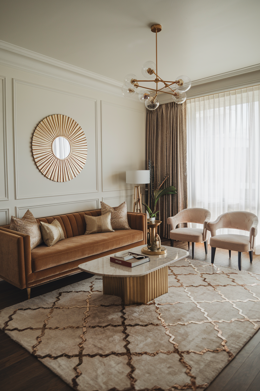 Glam up your space with rugs that feature hints of metallic thread or shimmer. Subtle gold or silver accents can catch the light and elevate your living room with understated luxury. These rugs pair well with modern glam interiors, especially those with mirrored or glass furniture, and are ideal for special areas like formal sitting rooms.