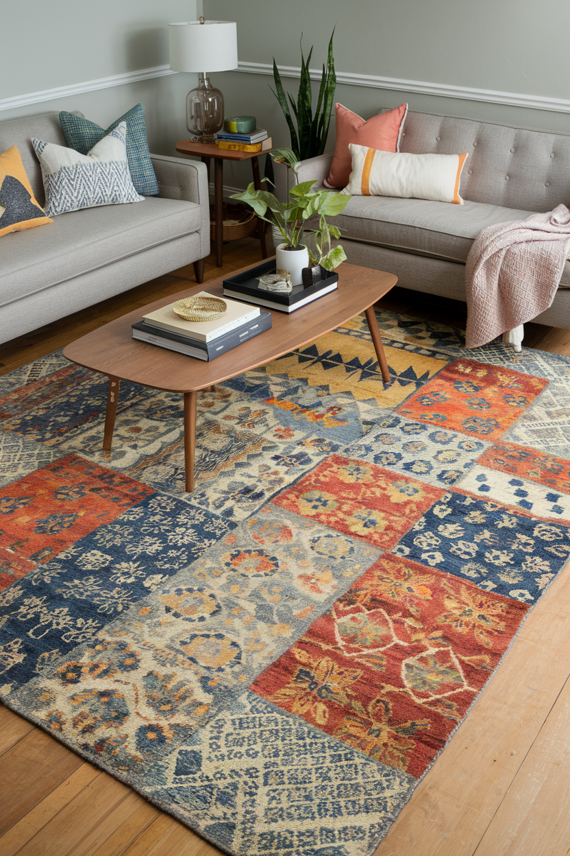 Patchwork rugs combine several patterns and shades, giving the space a rich, layered look. They work particularly well in eclectic or maximalist living rooms. Each patch tells its own visual story, which brings a sense of curated character to your decor. Whether you’re mixing modern art, vintage furniture, or global accents, these rugs help unify disparate styles into a cohesive and vibrant whole.