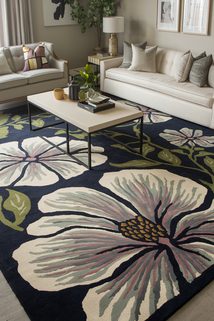 A large-scale floral print rug makes a vibrant statement and introduces organic energy into your space. Look for oversized petals in saturated colors for a striking effect. These rugs are a great way to inject femininity, whimsy, or romantic flair, depending on the type of floral design. Paired with solid-colored upholstery or neutral walls, they create a beautiful visual centerpiece.
