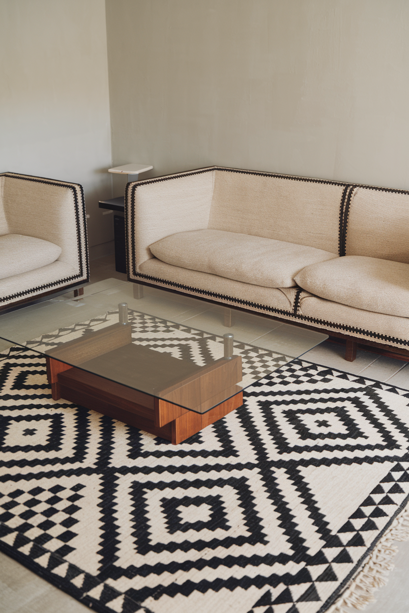 Go for a bold visual impact with a high-contrast black and white rug. The sharp lines and stark contrast can add modern drama to your living room and make lighter furnishings pop beautifully. This design is especially striking in minimalist or contemporary interiors, where the contrast draws the eye and creates instant sophistication. Use these rugs as a foundation for monochrome themes or as a dramatic counterpoint to vibrant accent colors.