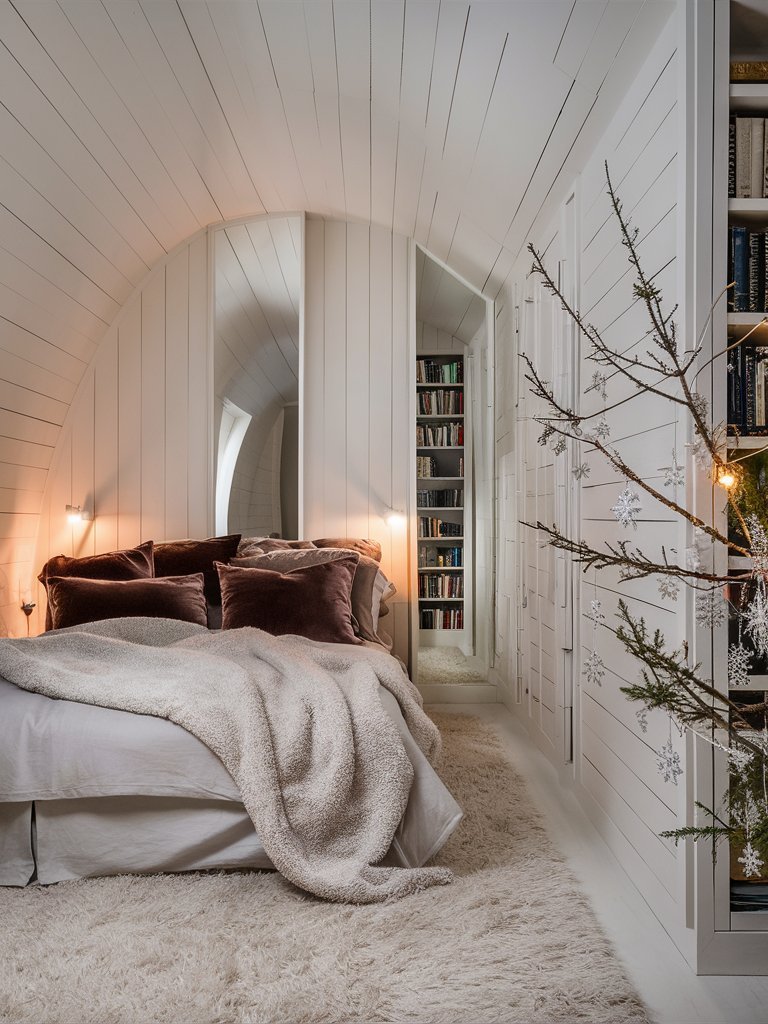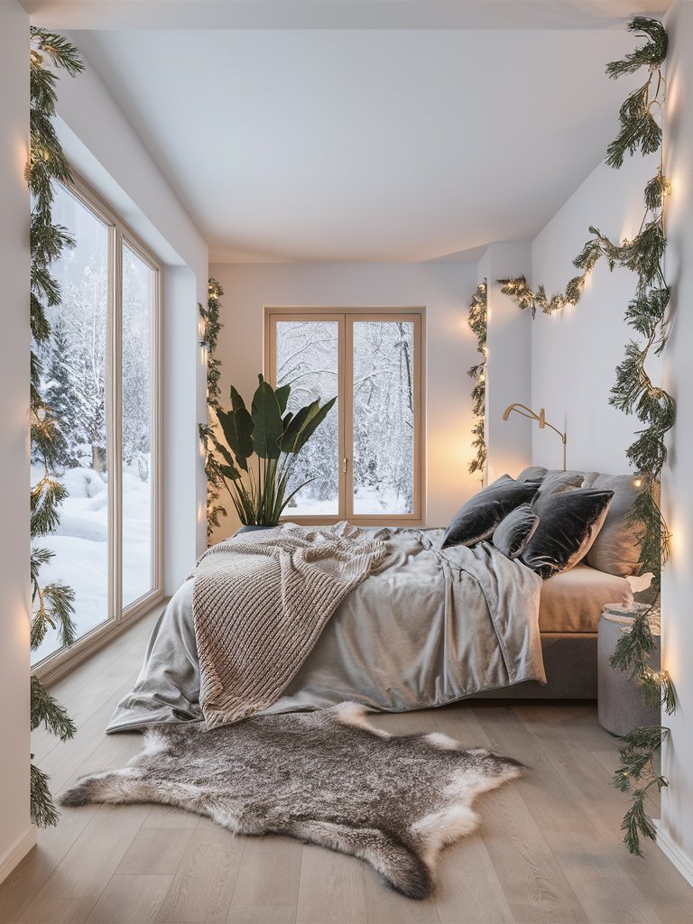 The room is filled with soft, furry accents, from the plush blanket to the thick, textured rug, adding layers of warmth. These tactile elements make the space feel incredibly inviting, especially during colder months. This approach to texture can inspire you to incorporate cozy fabrics like faux fur or sherpa into your own bedrooms, bringing in an extra touch of winter luxury.