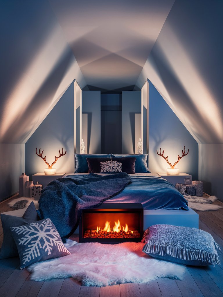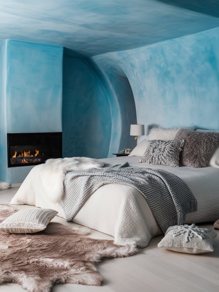 The walls and ceiling are painted in a soft, icy blue, which gives the room a frosty, winter-like ambiance. This color choice creates a serene, almost ethereal backdrop reminiscent of snow and ice, setting a soothing, cool-toned foundation for the cozy accents that follow. It provides a beautiful contrast to the warmer elements in the room, like the plush bedding and the fireplace.