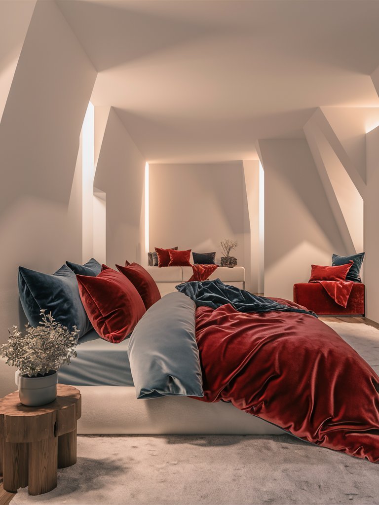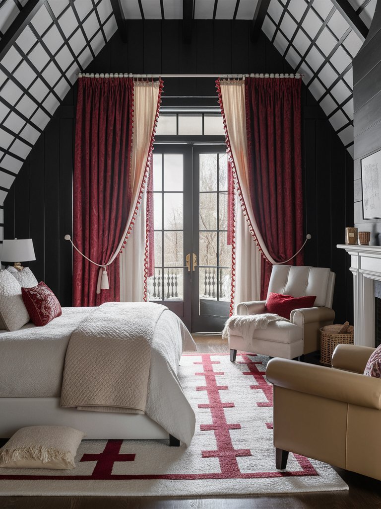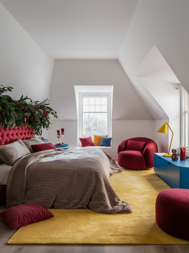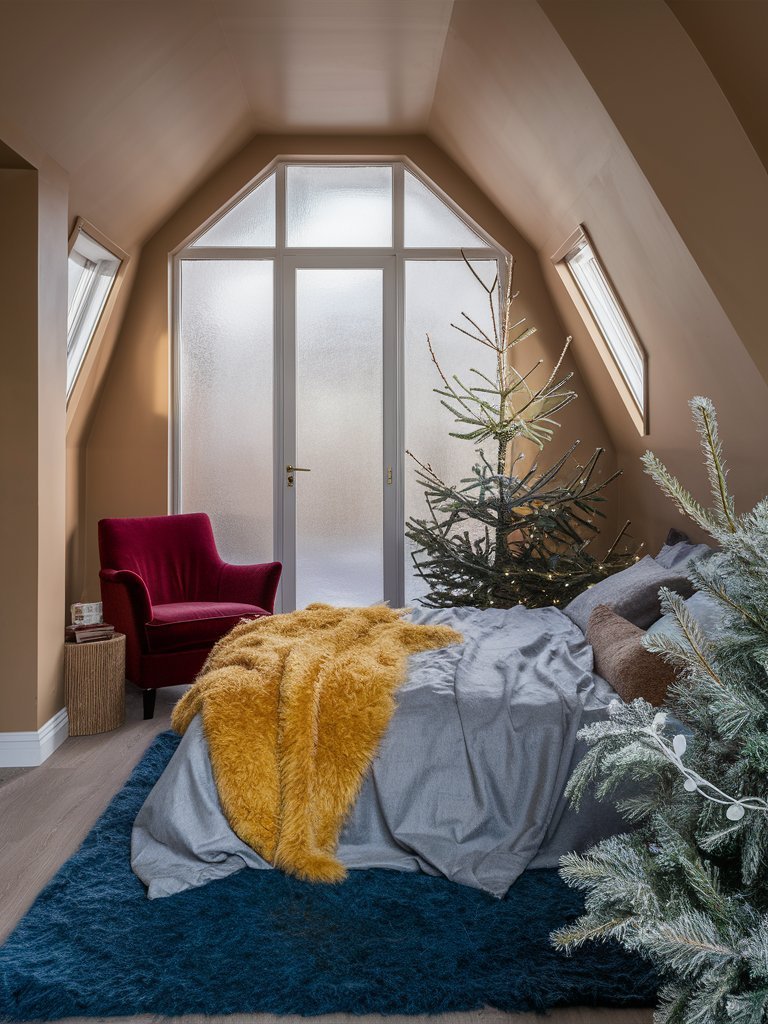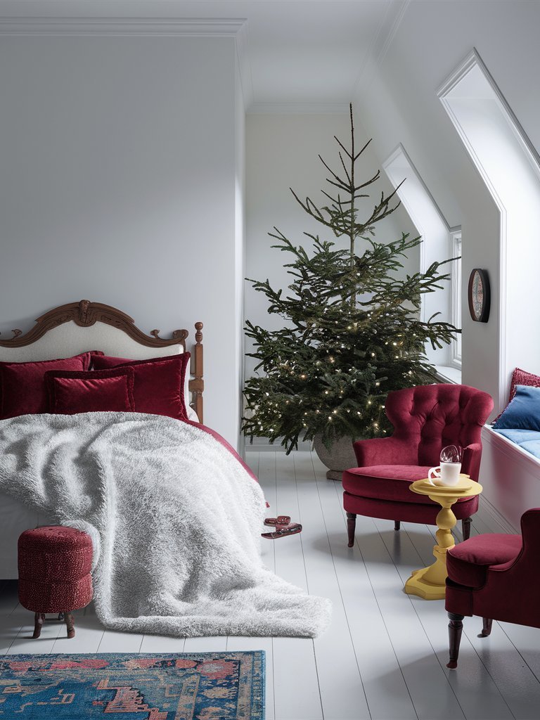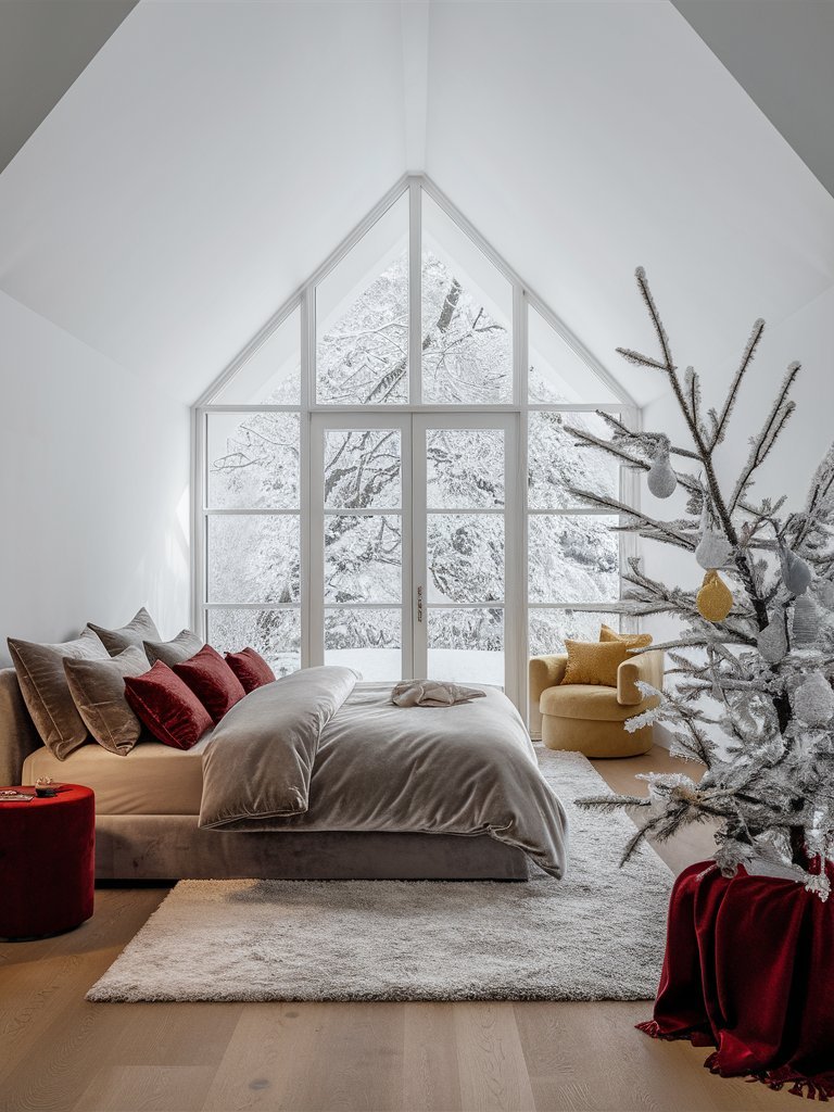 The bold red velvet chair and mustard-yellow faux fur throw are powerful accent pieces that inject color and personality into the room. These vibrant colors stand out against the neutral background, adding a festive touch that feels seasonal without overwhelming the space. This use of color can inspire readers to experiment with strong, contrasting accents to create a visually engaging winter bedroom.
