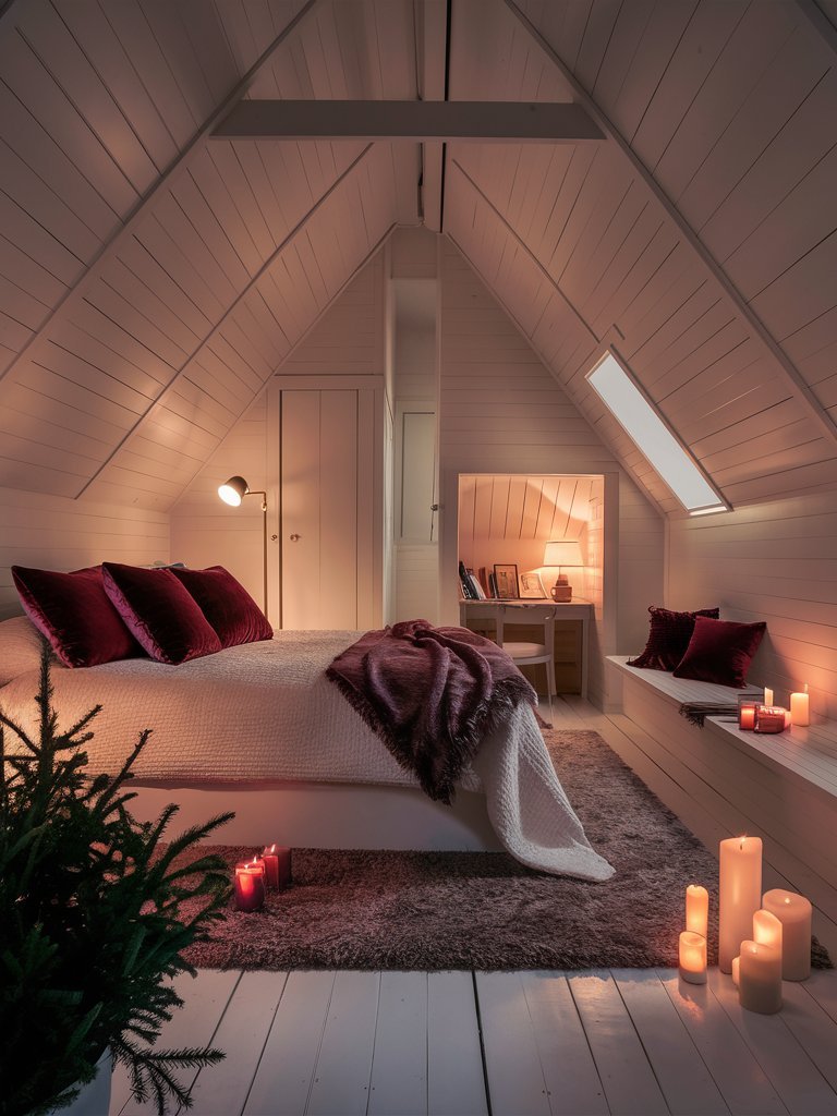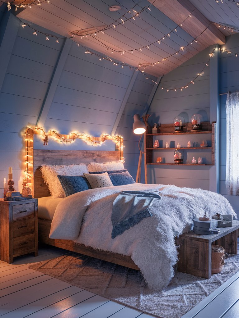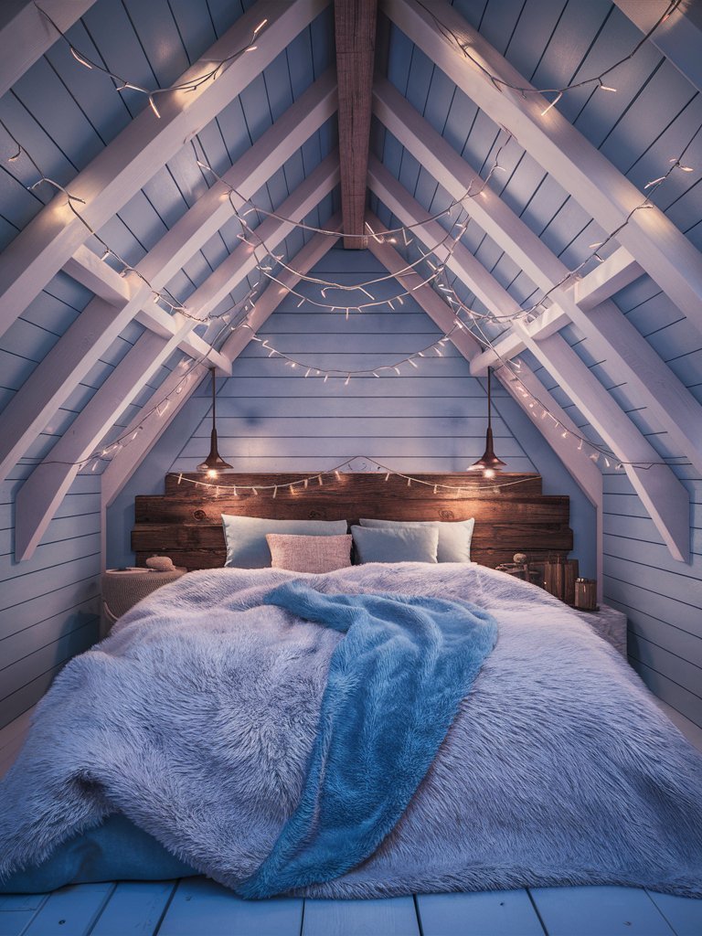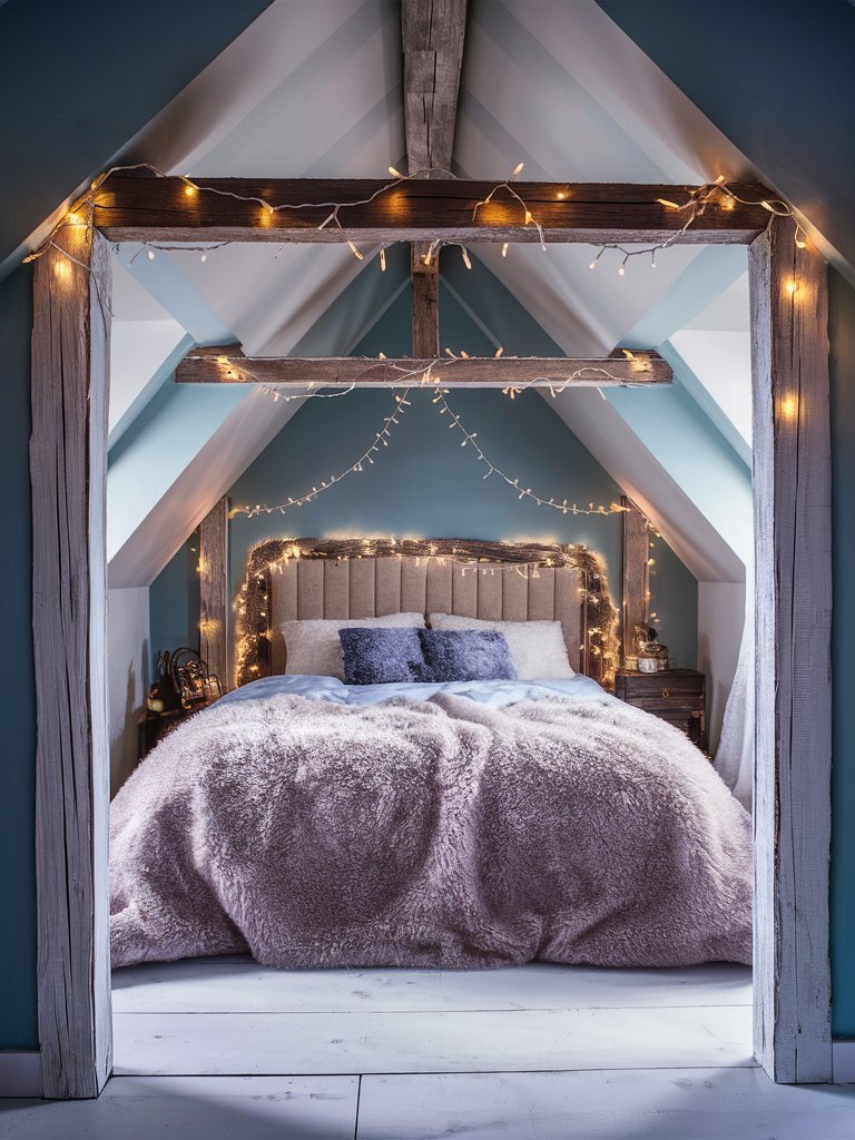 Through Draped along the rustic wooden beams and framing the bed, string lights cast a magical, soft glow throughout the room. The gentle, warm light they emit is reminiscent of a starlit winter sky, creating an ambiance that’s both soothing and festive. In the darker winter months, this lighting choice adds a cozy glow that feels like a personal retreat. By accentuating the architectural details, the lights also add depth, making the small space feel special and inviting without overwhelming it.