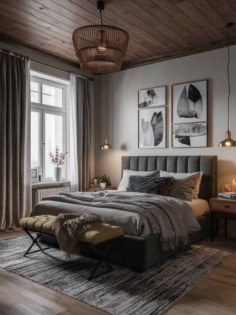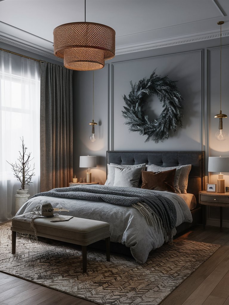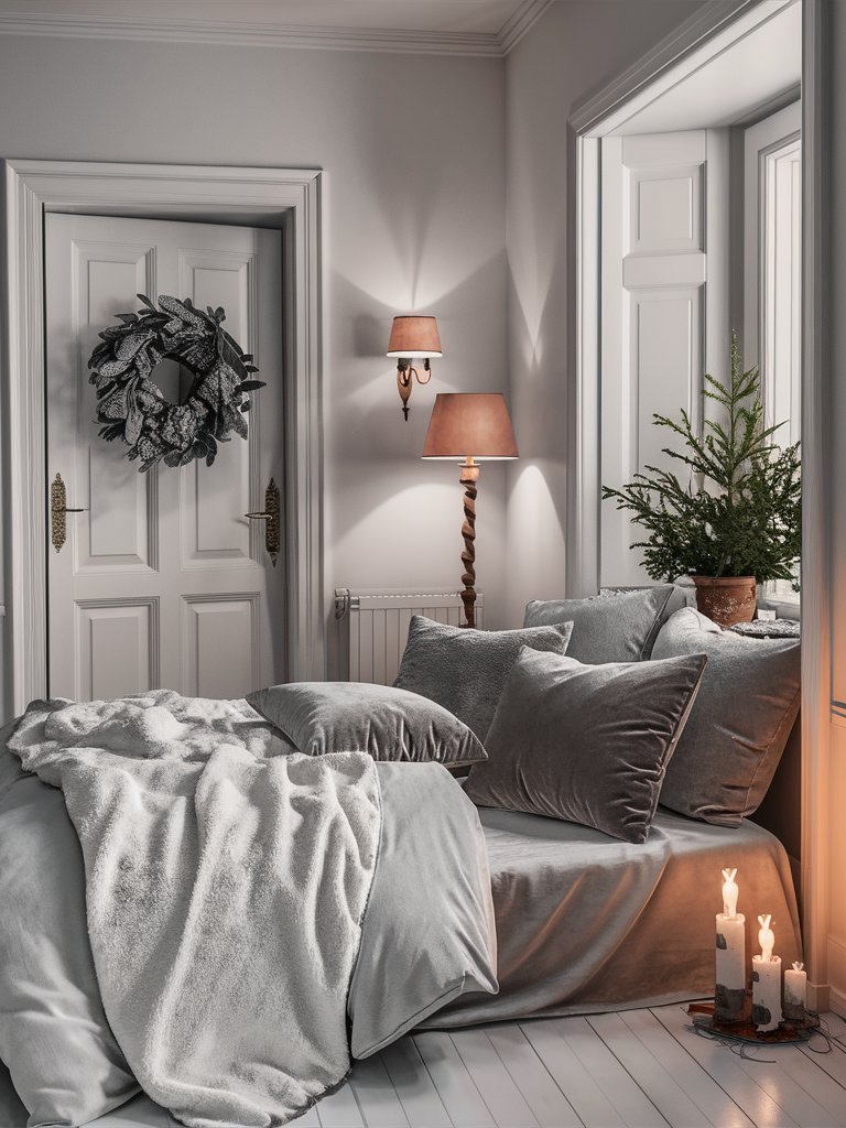 The bed, dressed in plush gray velvet and layered with textured pillows, exudes winter warmth. The luxurious fabric of the bedding invites relaxation and adds a tactile quality to the room. This setup emphasizes the impact of using rich textures to make a winter bedroom feel inviting, demonstrating how velvet and plush fabrics can elevate the comfort level of any sleeping space.