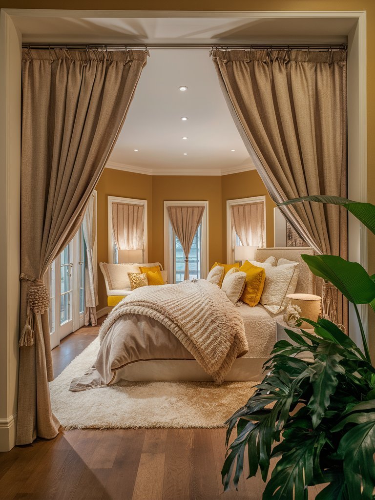 The room’s primary color palette, featuring shades of gold, beige, and warm yellow, instantly makes it feel cozy and inviting. These hues evoke a sense of warmth, which is ideal for winter decor. Gold tones bring sophistication, while beige and yellow accents add a cheerful touch. Together, they balance the room with a feeling of understated luxury, ensuring that the bedroom feels like a snug refuge from the chilly weather outside.
