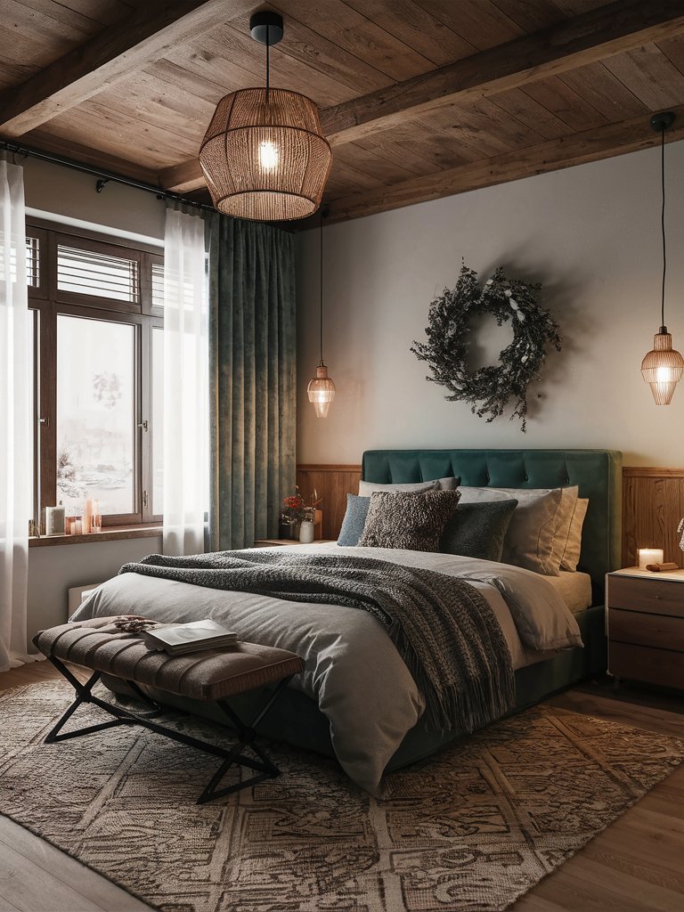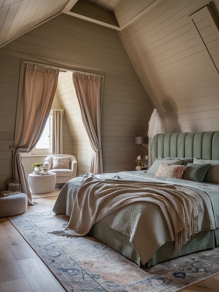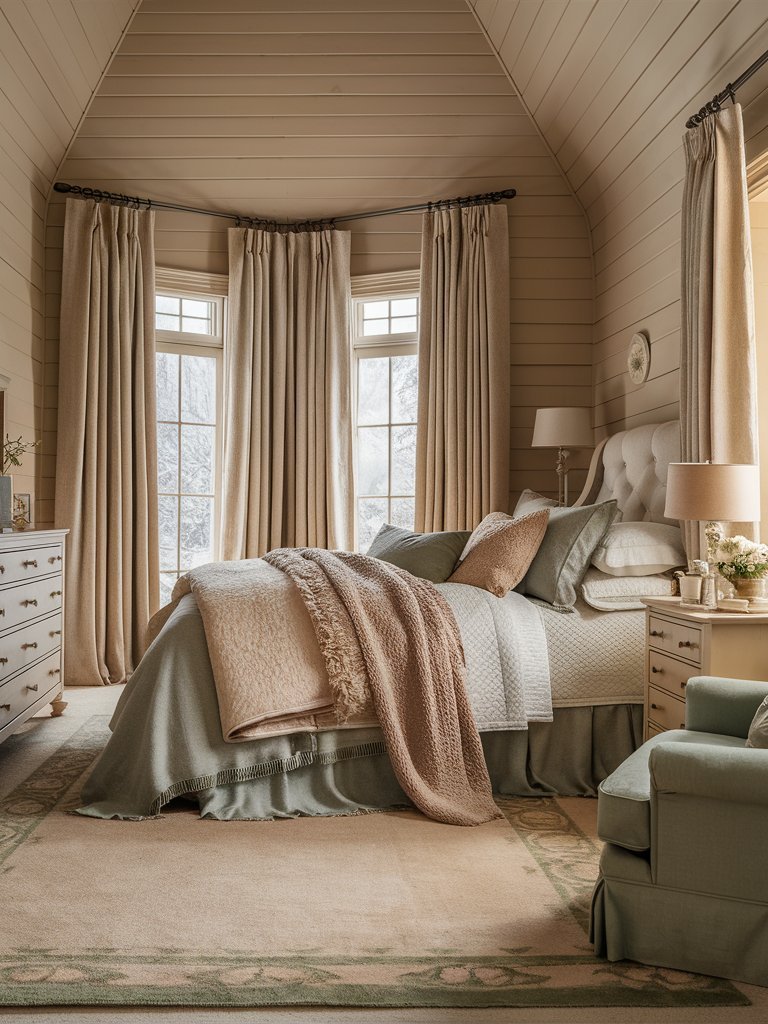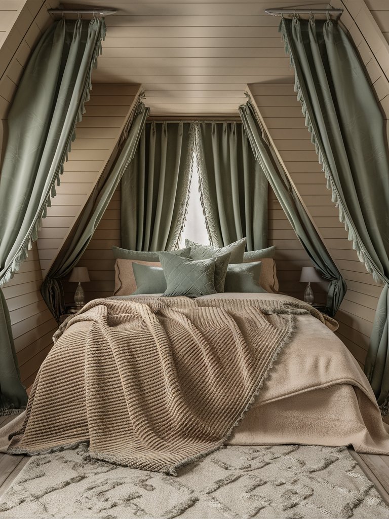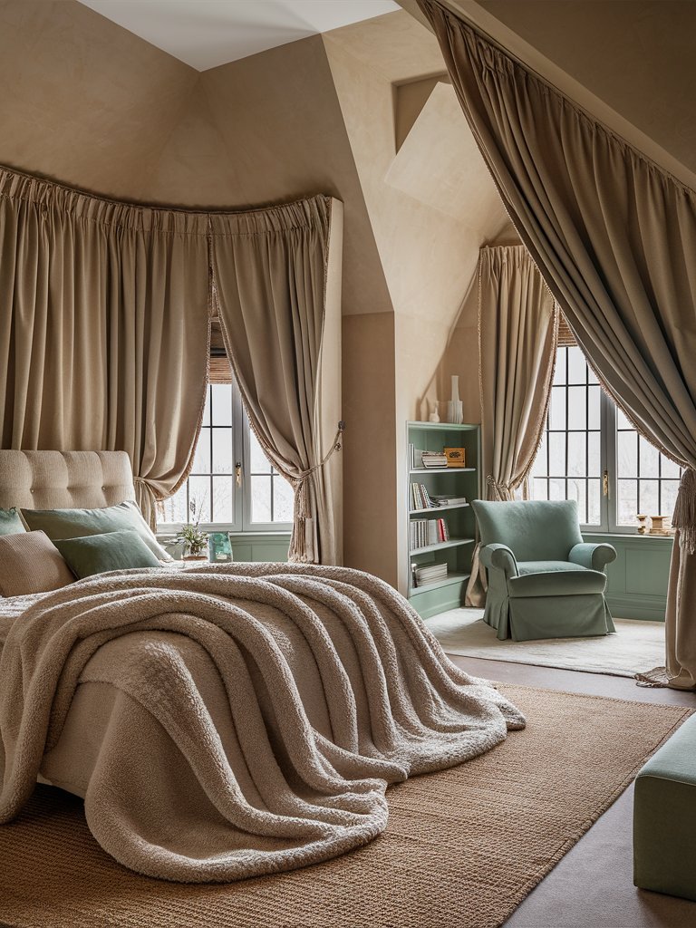 The surrounding sage green curtains offer more than just a decorative element, they create a private, cocoon-like environment around the bed. This design choice amplifies the coziness of the room, giving it a sense of intimacy that is perfect for the colder months. The muted green shade introduces a touch of nature into the space, subtly breaking up the neutrals with a calming, earthy tone. It’s a soothing color that complements the wood tones and harmonizes with the overall palette, while the draping effect adds a timeless, romantic quality to the setting.