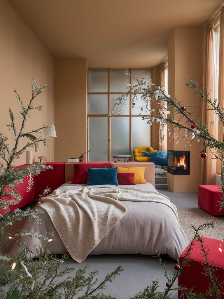 This bedroom embraces a unique color scheme, with deep reds, mustard yellows, and vibrant blues that bring warmth and personality to the space. The red tufted headboard, mustard rug, and bright blue console are unexpected choices that work beautifully together, adding depth and visual interest. This mix of warm and cool tones creates a dynamic environment that feels cozy yet invigorating, offering a lively take on winter decor that departs from traditional neutral or muted palettes.
