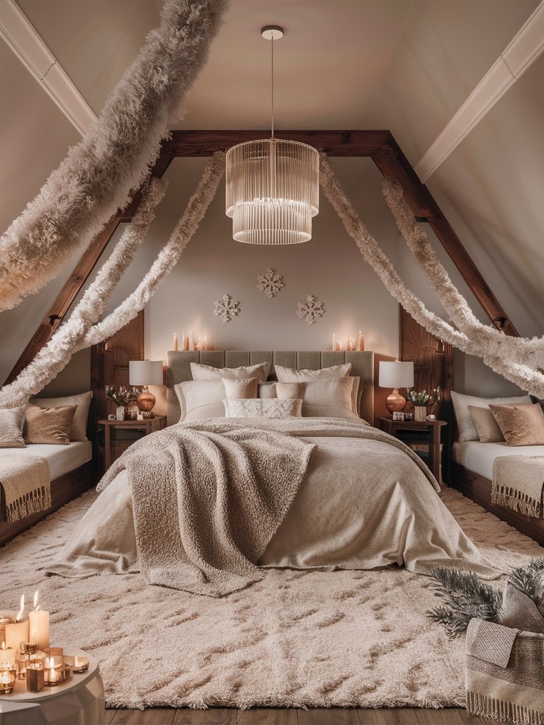 The vaulted ceiling with exposed beams gives the room an architectural interest, adding a sense of height and openness. The beams are painted in a soft white that complements the pastel palette, while their natural shape adds character to the space. This feature enhances the cozy yet spacious feel, making the room feel like a private winter escape tucked away in the attic.