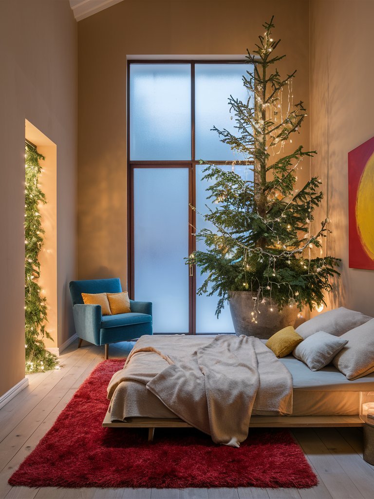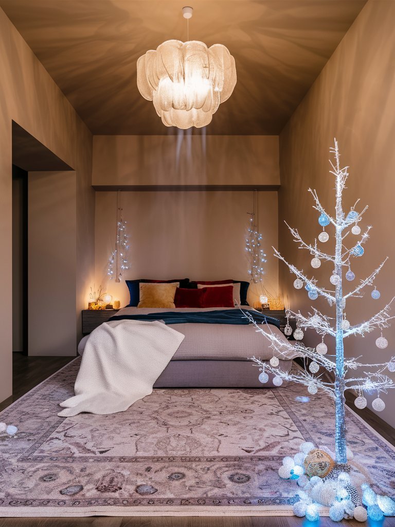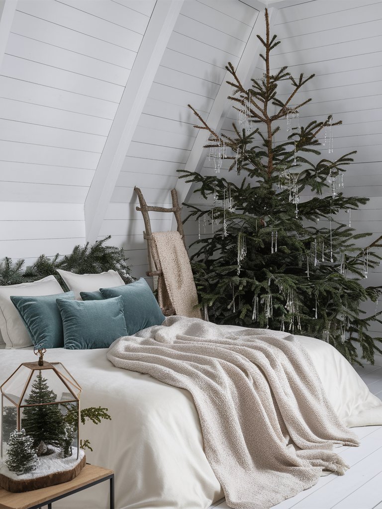 The room’s focal point is a minimally decorated evergreen tree adorned with delicate icicle-like ornaments, creating a festive yet understated holiday look. This natural decor approach keeps the space feeling serene and calm, drawing inspiration from a winter forest scene. It’s a reminder that sometimes a simple touch of nature can bring a refreshing seasonal vibe to a bedroom.