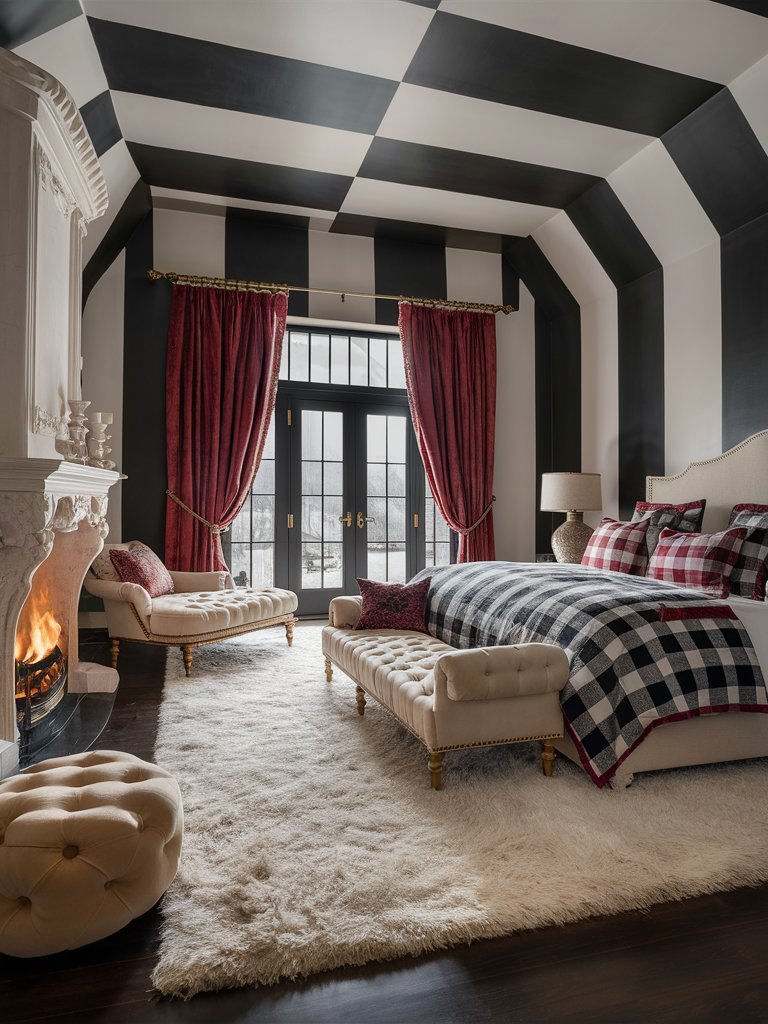 The checkered black and white ceiling is a striking feature that immediately draws the eye, adding depth and sophistication to the room. This unexpected element breaks the monotony and gives the space a sense of grandeur, demonstrating how bold ceiling patterns can elevate a winter bedroom by creating visual interest.