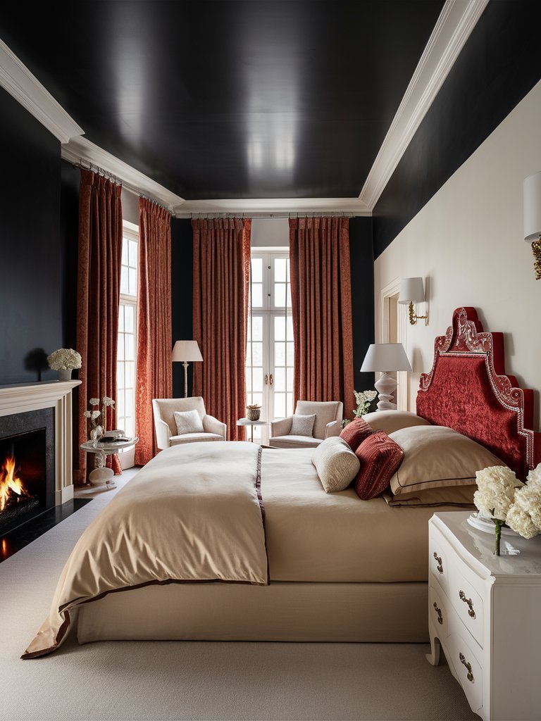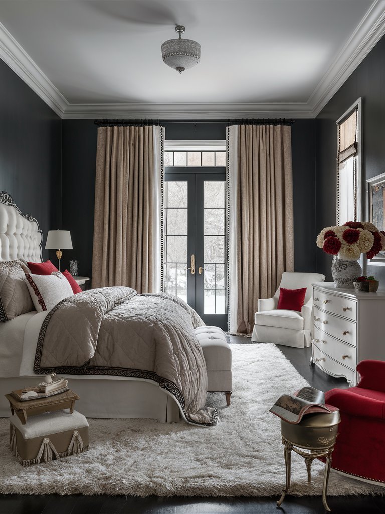 The dark walls set a dramatic, cozy tone, perfect for winter, while the warm beige, ivory, and rich red accents create a striking contrast. The deep wall color helps to absorb the winter light, making the space feel intimate, while the softer tones in the bedding and decor add warmth and brightness. The touches of red in the pillows and floral arrangement add a festive, seasonal flair without overwhelming the room.