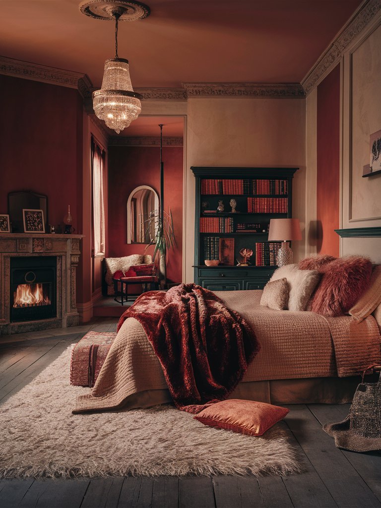 The bold, earthy red tones on the walls immediately set the stage for a cozy, embracing space. This color choice exudes warmth and depth, ideal for a winter bedroom where coziness is paramount. Unlike cooler or lighter tones, which may feel more open and airy, this rich shade creates an intimate atmosphere, making the room feel like a snug hideaway. This color anchors the room, giving it a bold personality while promoting a sense of warmth and security that’s essential for a winter haven.