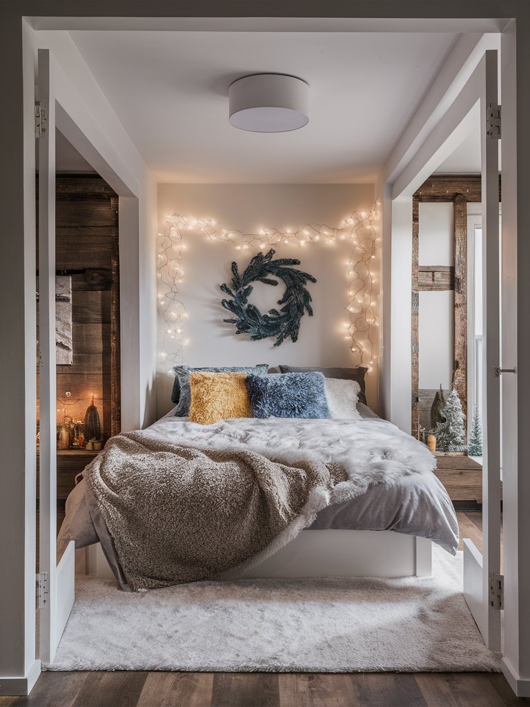 The large winter wreath hung above the bed is a simple yet impactful decor choice. It adds a seasonal touch that’s subtle and tasteful, complementing the winter theme without feeling overly festive. This piece enhances the room’s wintery charm and draws the eye upward, giving the room an added sense of height and elegance.