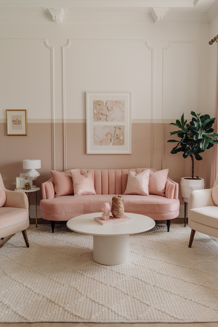 Combining soft pink upholstery with marble accents creates a luxurious, sophisticated feel in your living room. The cool, sleek look of marble contrasts beautifully with the softness of the pink sofa, providing an elegant balance. This design works particularly well in high-end or modern living rooms where the goal is to create a serene, yet upscale space. Marble details, whether through coffee tables, side tables, or flooring, pair well with a pink sofa to create a luxurious vibe that’s stylish and opulent.