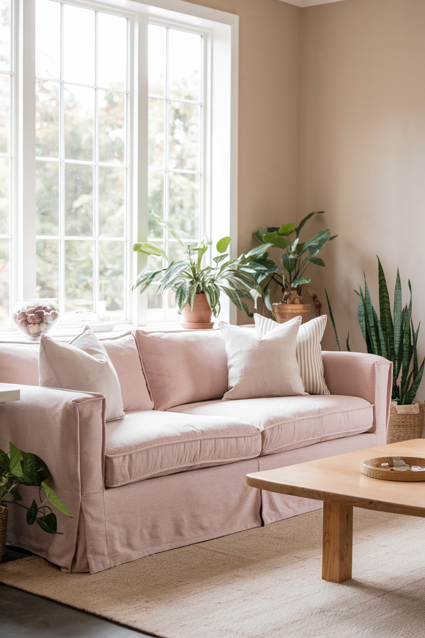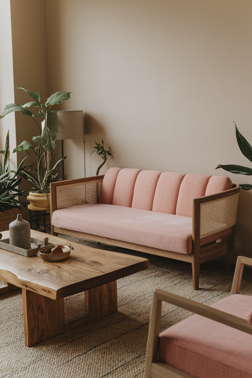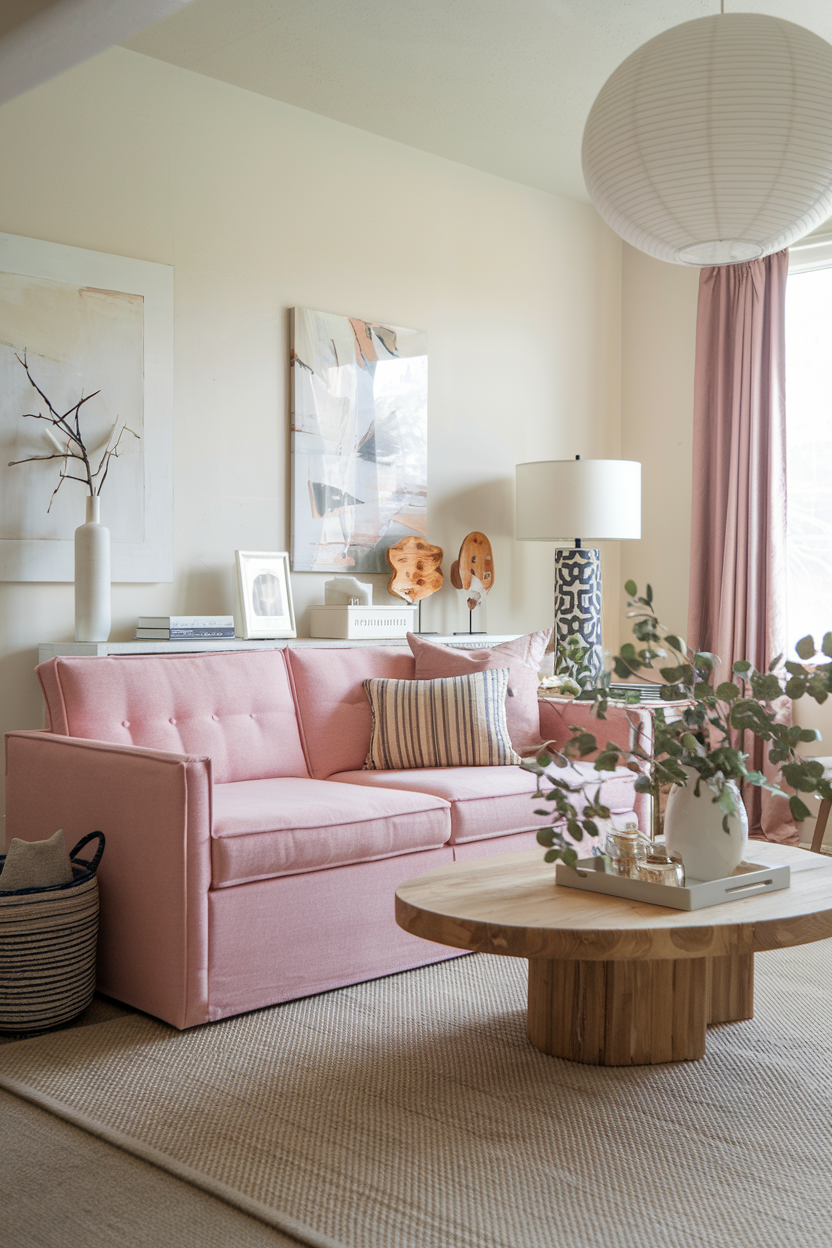 Natural materials, layered textures, and neutral backdrops allow a pink sofa to shine without overwhelming the space. Clean lines and thoughtful accessories help refine the look, while bolder pairings like patterned rugs or colorful artwork make it feel curated and full of character.