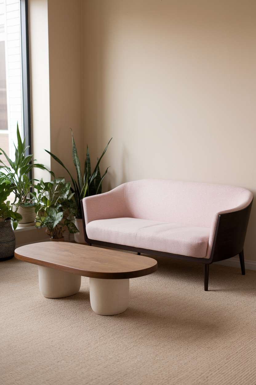 A light pink sofa with a dark wood frame offers a stunning contrast between the soft, warm tones of the fabric and the rich, natural wood. This combination adds depth and sophistication to your living room, making it perfect for both traditional and contemporary settings. The dark wood frame grounds the softness of the light pink, creating a balanced look that’s both elegant and welcoming. This style is ideal for those who enjoy timeless pieces with a classic touch.