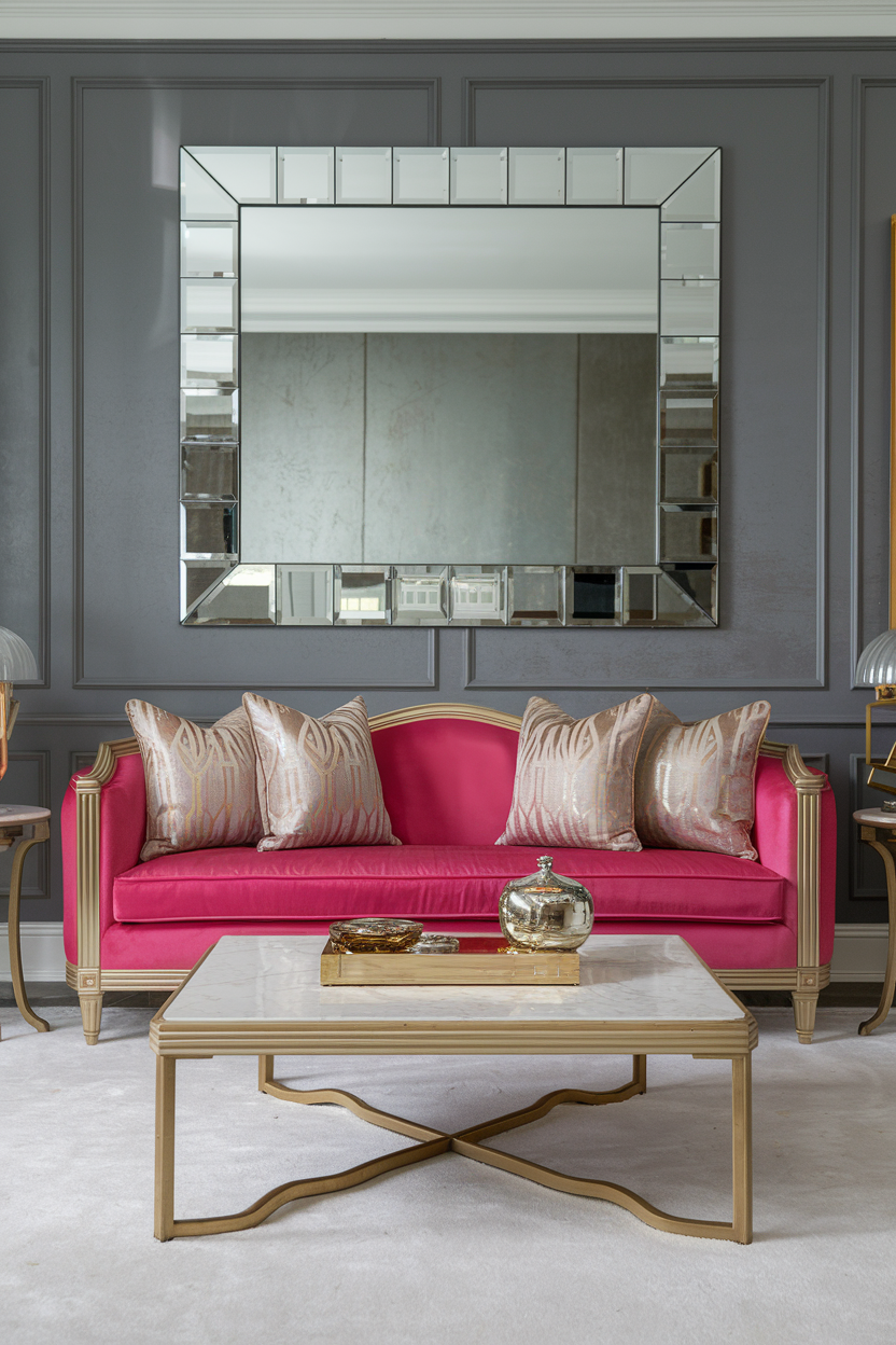 A hot pink sofa with metallic accents, such as gold or silver, adds a glamorous touch to your living room. The bold, vibrant color is softened by the reflective sheen of metallic detailing, creating a striking balance between boldness and elegance. The metallic accents on the legs, cushions, or trim introduce a level of refinement and opulence, making this sofa perfect for those who want their living room to feel both lively and luxurious. This style works beautifully in high-end or glamorous spaces, creating a focal point that elevates the entire room’s design.