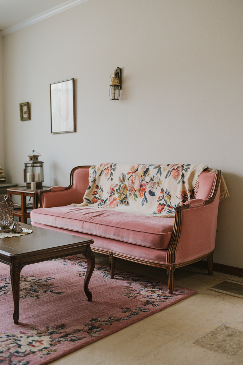 A classic pink sofa paired with a floral throw blanket brings a cozy and inviting touch to your living room. The pink upholstery adds warmth, while the floral throw brings color and texture, enhancing the sofa’s appeal. The blanket not only serves as an additional layer of comfort but also introduces a tactile element, making the space feel homier. This combination works especially well in cottage-style or country-inspired interiors, where comfort and charm are key design elements.