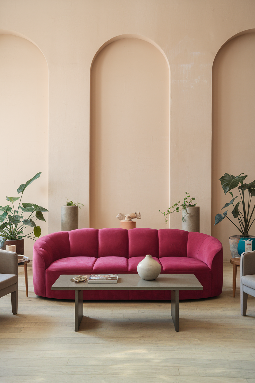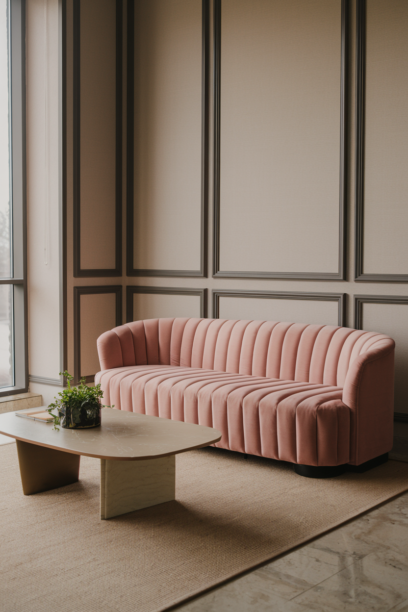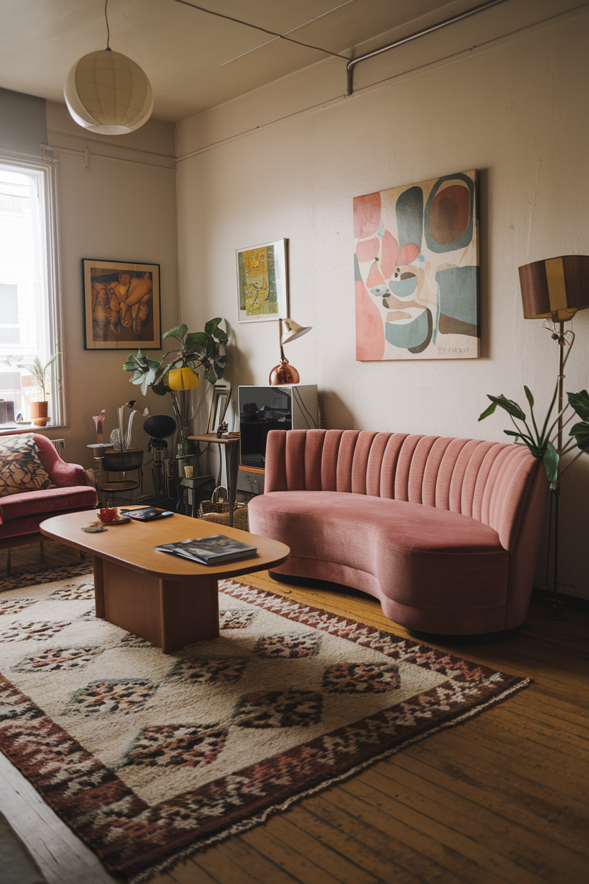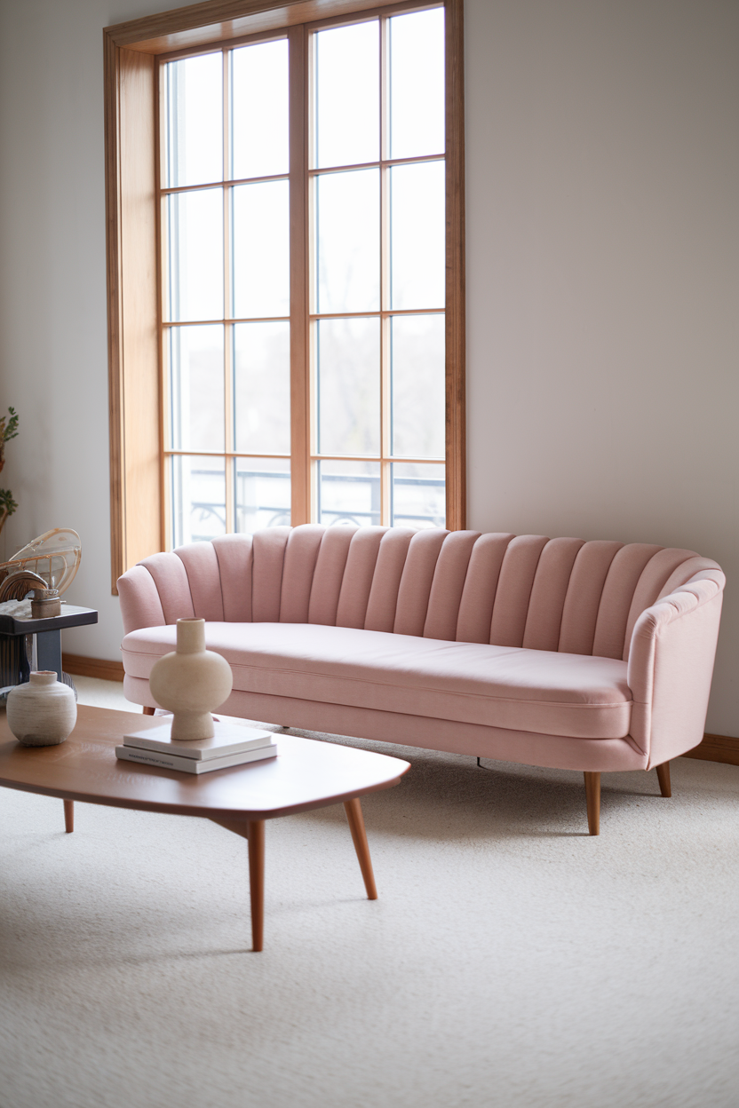 For a retro-inspired living room, a curved pink sofa adds vintage charm and sophistication. The soft, rounded edges of the sofa evoke a sense of nostalgia, reminiscent of mid-century modern designs. The pink color softens the retro style, bringing a playful yet refined vibe to the room. This design works beautifully in vintage or eclectic interiors, where a mix of old and new elements creates a cozy and unique space. The curved shape also helps to open up the room, making it feel more spacious and inviting.