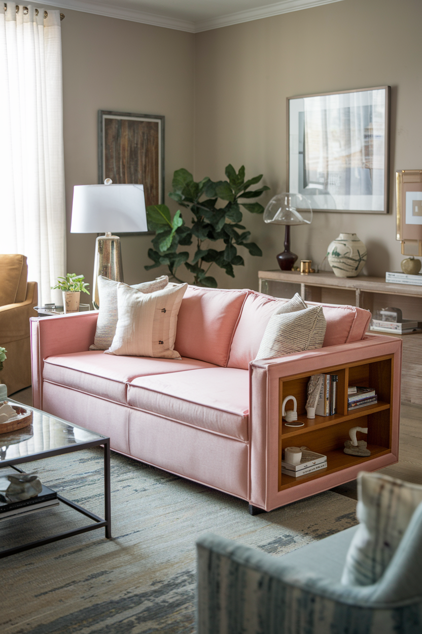 A chic pink sofa with side storage compartments blends practicality with beauty, offering both seating and storage solutions. The clever addition of hidden storage under the armrests or in the cushions ensures you can keep your living room organized while maintaining a sleek, stylish look. This type of sofa is perfect for small spaces or homes that need to maximize storage without sacrificing style. Whether it’s used to store blankets, pillows, or other living room essentials, this functional piece keeps your space neat and clutter-free.