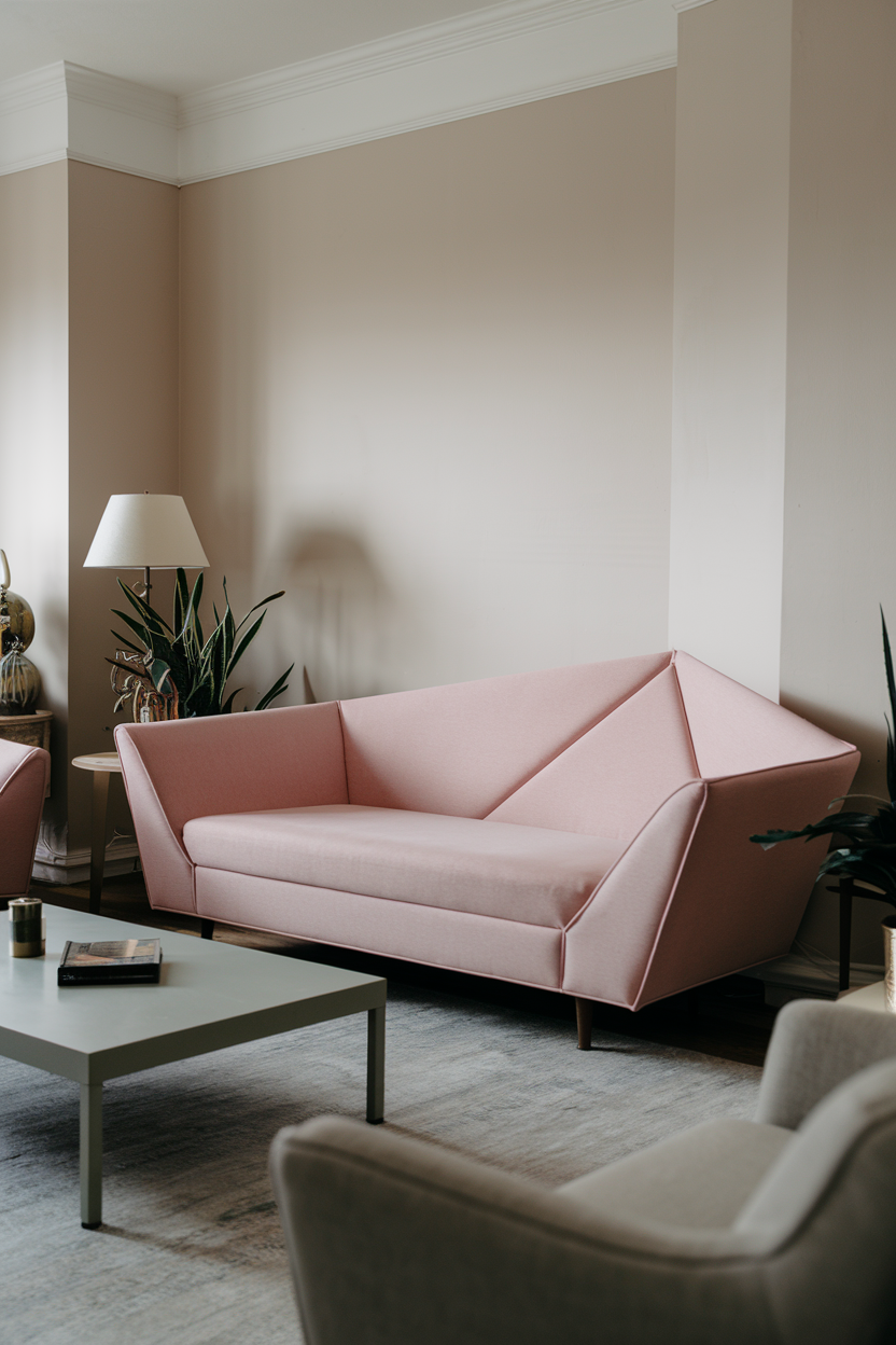For those who love modern art and bold design, a geometric pink sofa is a statement piece that combines creativity with comfort. The clean, sharp lines and unique shapes of the sofa create a visually striking element in your living room. The pink color enhances the boldness of the geometric patterns, adding a sense of playfulness and excitement. This sofa works best in contemporary spaces where bold design is celebrated, and it can easily become the focal point of your room.