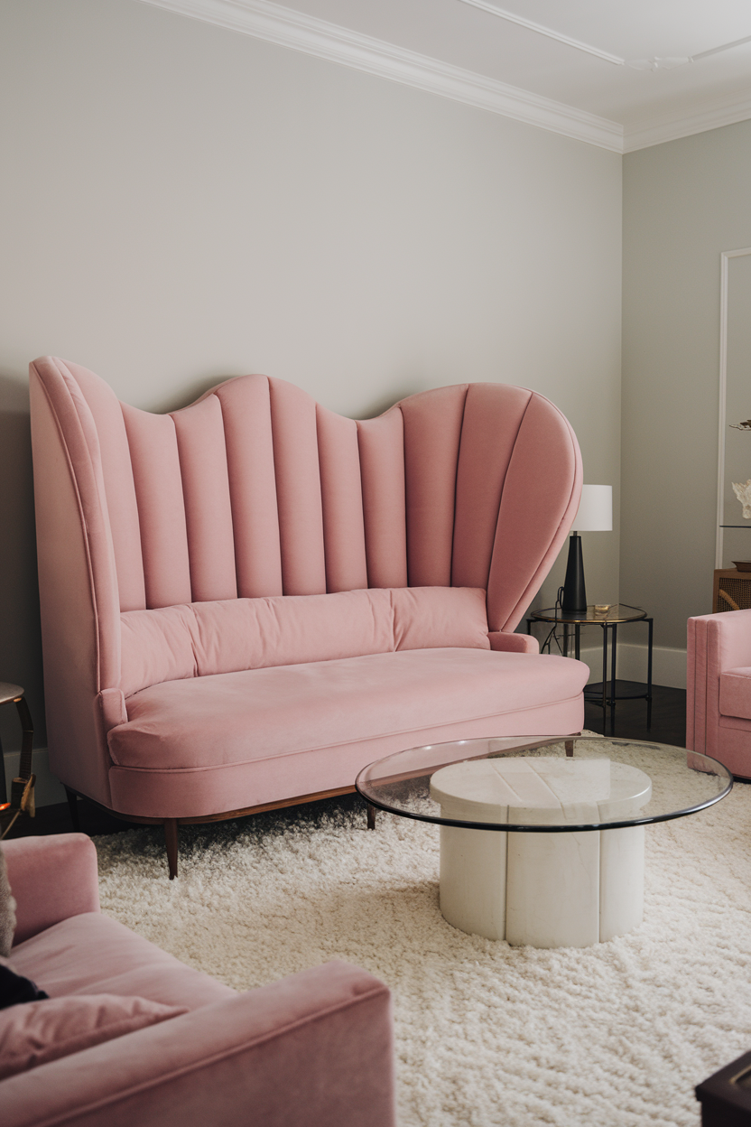 A pink sofa with a dramatic backrest design not only serves as a comfortable seating option but also as a work of art. The unique shape of the backrest, whether it’s arched, curved, or angular, adds an extra dimension of style to the piece. The bold pink upholstery enhances the dramatic form, ensuring the sofa is a focal point of the room. This design is perfect for those looking to make a strong design statement with a piece of furniture that combines beauty and function.